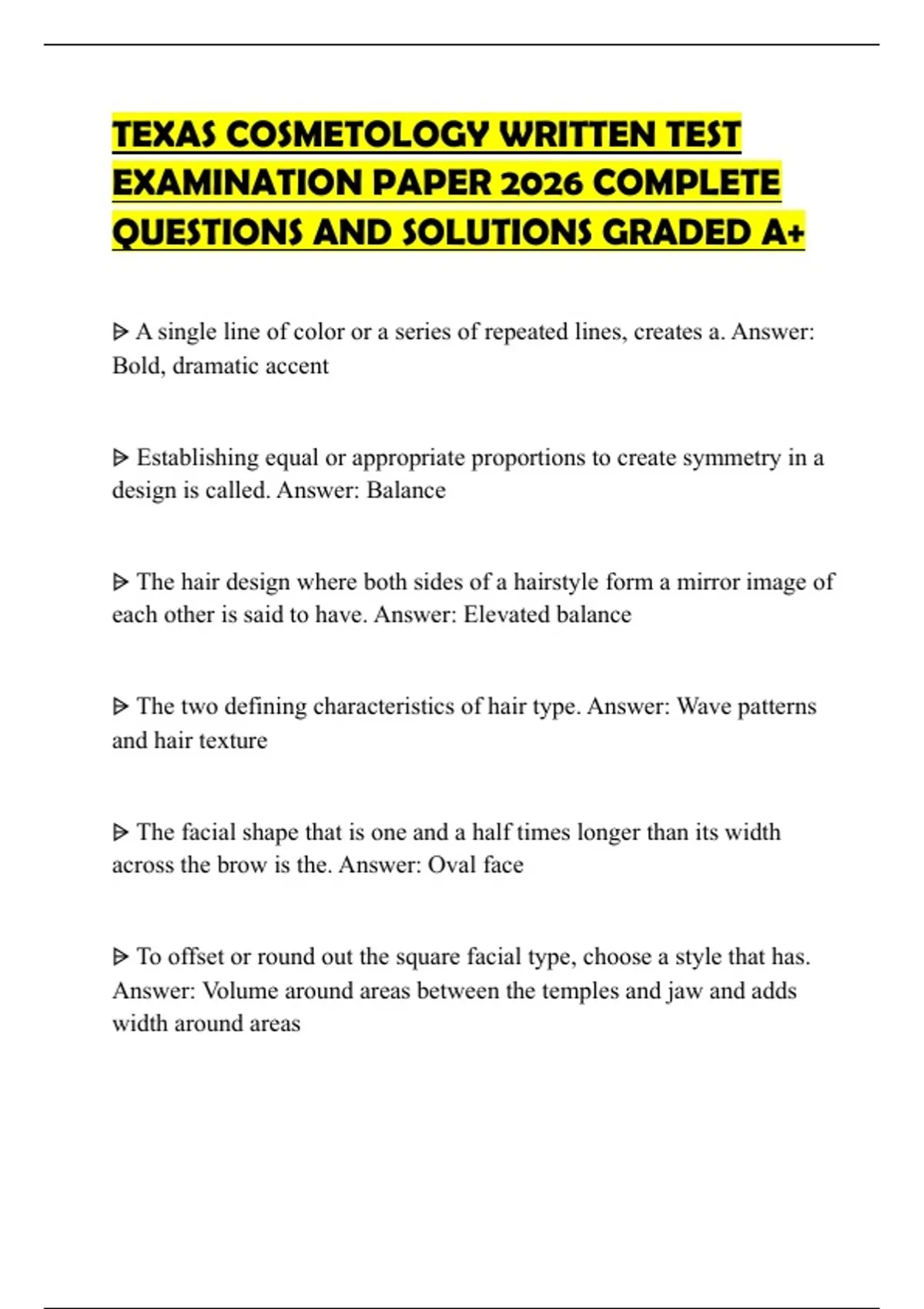 TEXAS COSMETOLOGY WRITTEN TEST EXAMINATION PAPER 2026 COMPLETE QUESTIONS AND SOLUTIONS GRADED A+