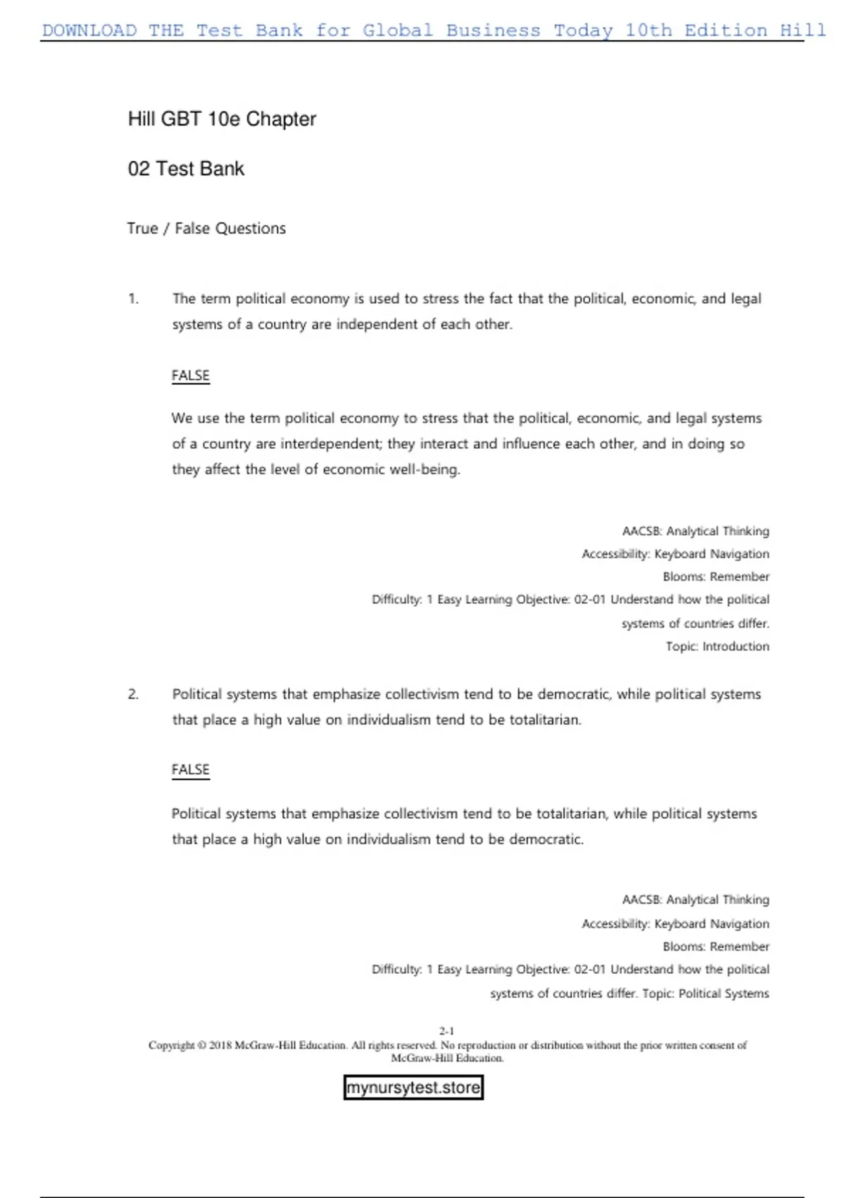 , DOWNLOAD THE Test Bank for Global Business Today 10th Edition Hill
