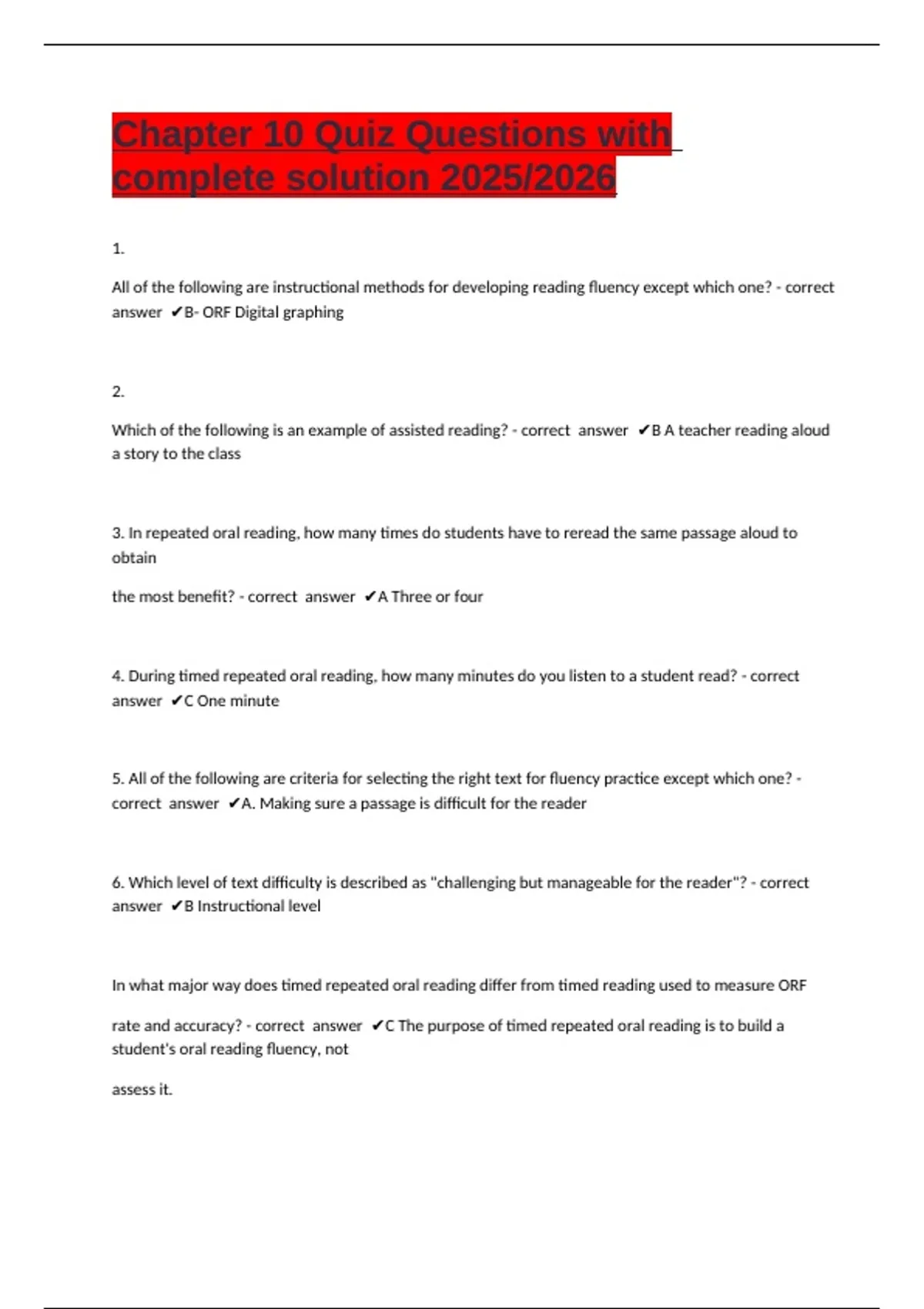 Chapter 10 Quiz Questions with complete solution 2025/2026 1. All of the following are instructional methods for developing reading fluency except which one? - correct answer B- ORF Digital graphing 2. Which of the following is an example of assisted reading? - correct answer B A teacher reading aloud a story to the class 3. In repeated oral reading, how many times do students have to reread the same passage aloud to obtain the most benefit? - correct answer A Three or four 4. During timed repeated oral reading, how many minutes do you listen to a student read? - correct answer C One minute 5. All of the following are criteria for selecting the right text for fluency practice except which one? - correct answer A. Making sure a passage is difficult for the reader 6. Which level of text difficulty is described as "challenging but manageable for the reader"? - correct answer B Instructional level