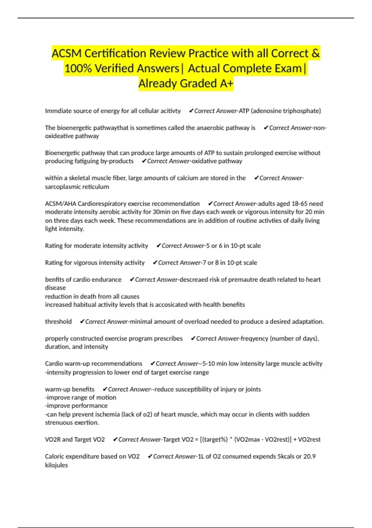 ACSM/AHA Cardiorespiratory exercise recommendation ✔Correct Answer-adults aged 18-65 need