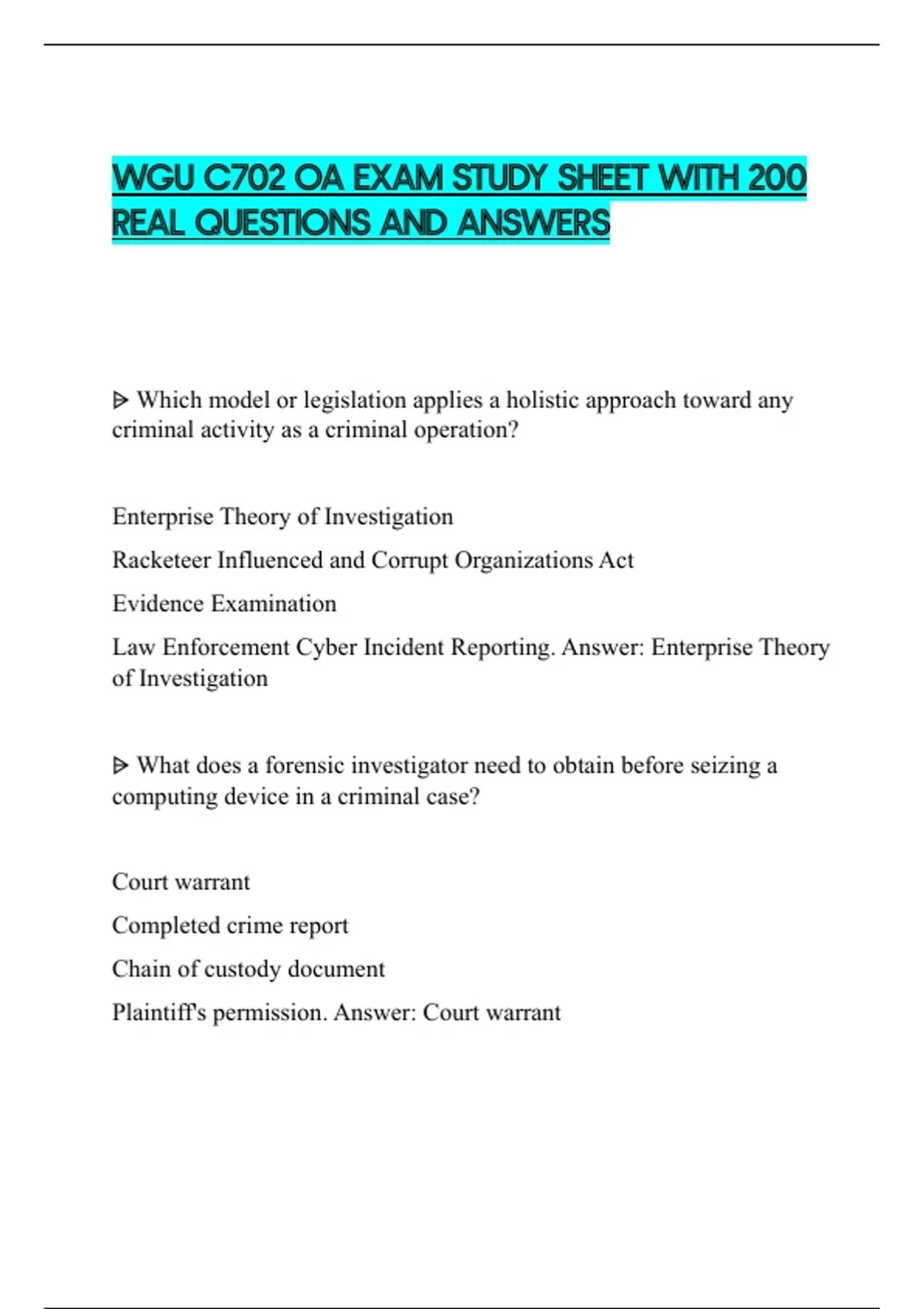 WGU C702 OA EXAM STUDY SHEET WITH 200 REAL QUESTIONS AND ANSWERS