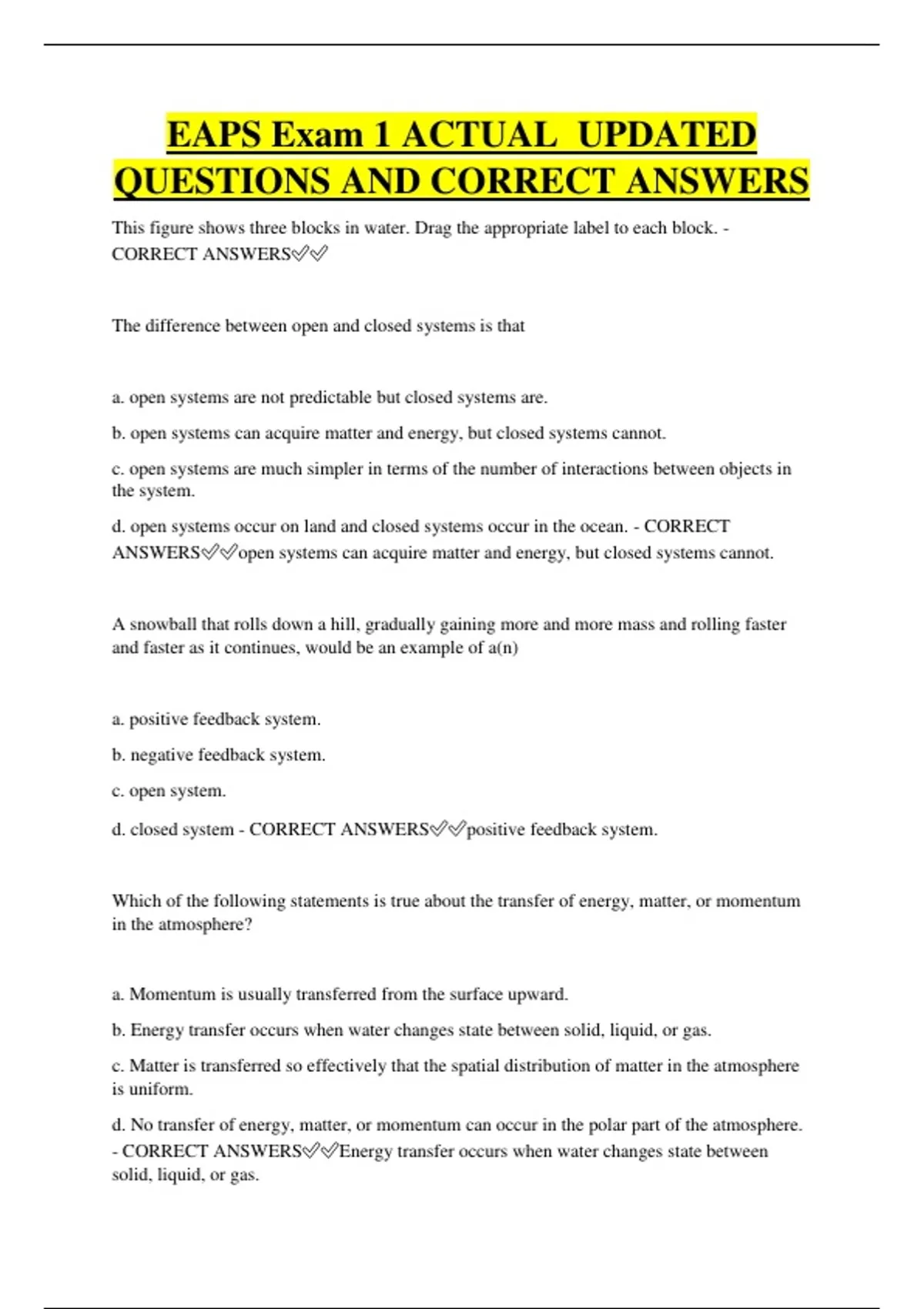 EAPS Exam 1 ACTUAL UPDATED QUESTIONS AND CORRECT ANSWERS This figure shows three blocks in water. Drag the appropriate label to each block. - CORRECT ANSWERS The difference between open and closed systems is that a. open systems are not predictable but closed systems are. b. open systems can acquire matter and energy, but closed systems cannot. c. open systems are much simpler in terms of the number of interactions between objects in the system. d. open systems occur on land and closed systems occur in the ocean. - CORRECT ANSWERSopen systems can acquire matter and energy, but closed systems cannot. A snowball that rolls down a hill, gradually gaining more and more mass and rolling faster and faster as it continues, would be an example of a(n) a. positive feedback system. b. negative feedback system. c. open system. d. closed system - CORRECT ANSWERSpositive feedback system. Which of the following statements is true about the transfer of energy, matter, or momentum in the atmosphere? a. Momentum is usually transferred from the surface upward. b. Energy transfer occurs when water changes state between solid, liquid, or gas. c. Matter is transferred so effectively that the spatial distribution of matter in the atmosphere is uniform. d. No transfer of energy, matter, or momentum can occur in the polar part of the atmosphere. - CORRECT ANSWERSEnergy transfer occurs when water changes state between solid, liquid, or gas. The cycling of chemical substances throughout the biosphere is accomplished through a. vertical transfer of momentum. b. the first law of thermodynamics. c. the rock cycle. d. the work of living things and physical and chemical processes. - CORRECT ANSWERSthe work of living things and physical and chemical processes. In the rock cycle, sediment is stripped away and transported by the process of _____ after the process of _______ has taken place. a. erosion; weathering b. weathering; erosion c. uplift; solidification d. solidification; uplift - CORRECT ANSWERSerosion; weathering Rates in the Earth system a. span the range from very rapid to very slow. b. are nearly always very slow. c. are nearly always very fast. d. can never be calculated accurately. - CORRECT ANSWERSspan the range from very rapid to very slow. Which potential geologic hazard is NOT represented by a feature on this figure? a. an earthquake b. a volcano c. contaminated groundwater d. a landslide - CORRECT ANSWERScontaminated groundwater Earth science can help us learn about Earth's past by studying