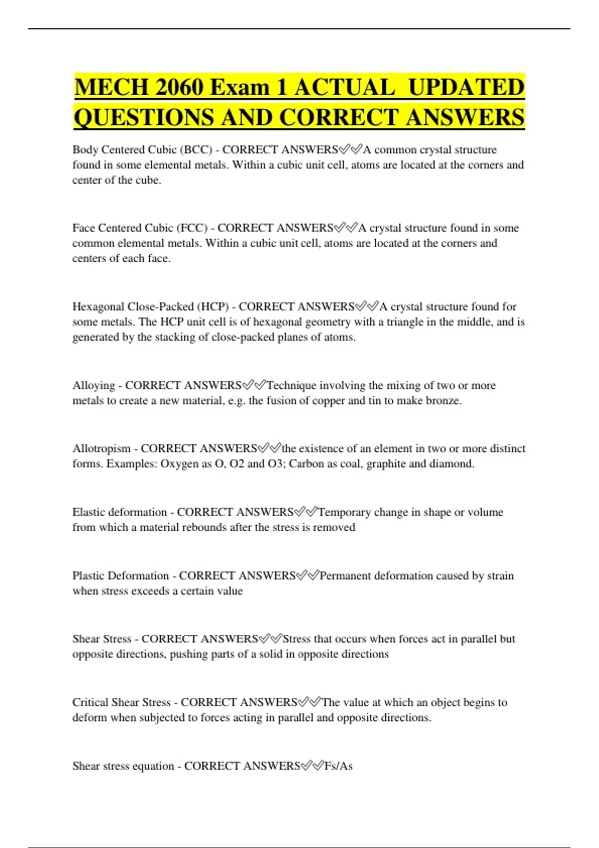 MECH 2060 Exam 1 ACTUAL UPDATED QUESTIONS AND CORRECT ANSWERS Body Centered Cubic (BCC) - CORRECT ANSWERSA common crystal structure found in some elemental metals. Within a cubic unit cell, atoms are located at the corners and center of the cube. Face Centered Cubic (FCC) - CORRECT ANSWERSA crystal structure found in some common elemental metals. Within a cubic unit cell, atoms are located at the corners and centers of each face. Hexagonal Close-Packed (HCP) - CORRECT ANSWERSA crystal structure found for some metals. The HCP unit cell is of hexagonal geometry with a triangle in the middle, and is generated by the stacking of close-packed planes of atoms. Alloying - CORRECT ANSWERSTechnique involving the mixing of two or more metals to create a new material, e.g. the fusion of copper and tin to make bronze. Allotropism - CORRECT ANSWERSthe existence of an element in two or more distinct forms. Examples: Oxygen as O, O2 and O3; Carbon as coal, graphite and diamond. Elastic deformation - CORRECT ANSWERSTemporary change in shape or volume from which a material rebounds after the stress is removed Plastic Deformation - CORRECT ANSWERSPermanent deformation caused by strain when stress exceeds a certain value Shear Stress - CORRECT ANSWERSStress that occurs when forces act in parallel but opposite directions, pushing parts of a solid in opposite directions Critical Shear Stress - CORRECT ANSWERSThe value at which an object begins to deform when subjected to forces acting in parallel and opposite directions. Shear stress equation - CORRECT ANSWERSFs/As applied shear force/ sheared area = Twinning Plane - CORRECT ANSWERSWhen critical shear stress is applied to a material, the material deforms and moves in opposite directions along this feature. This feature ought to bisect the atoms in a material diagonally. Slip Plane - CORRECT ANSWERSWhen critical shear stress is applied to a