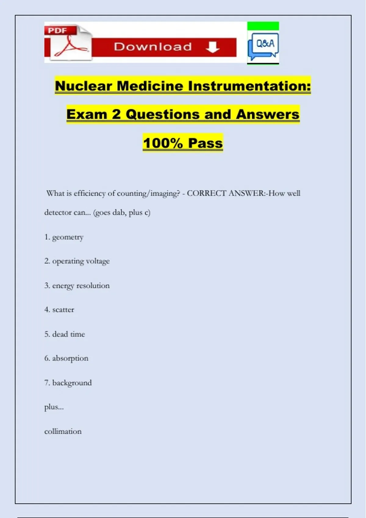 Nuclear Medicine Instrumentation: Exam 2 Questions and Answers 100% Pass