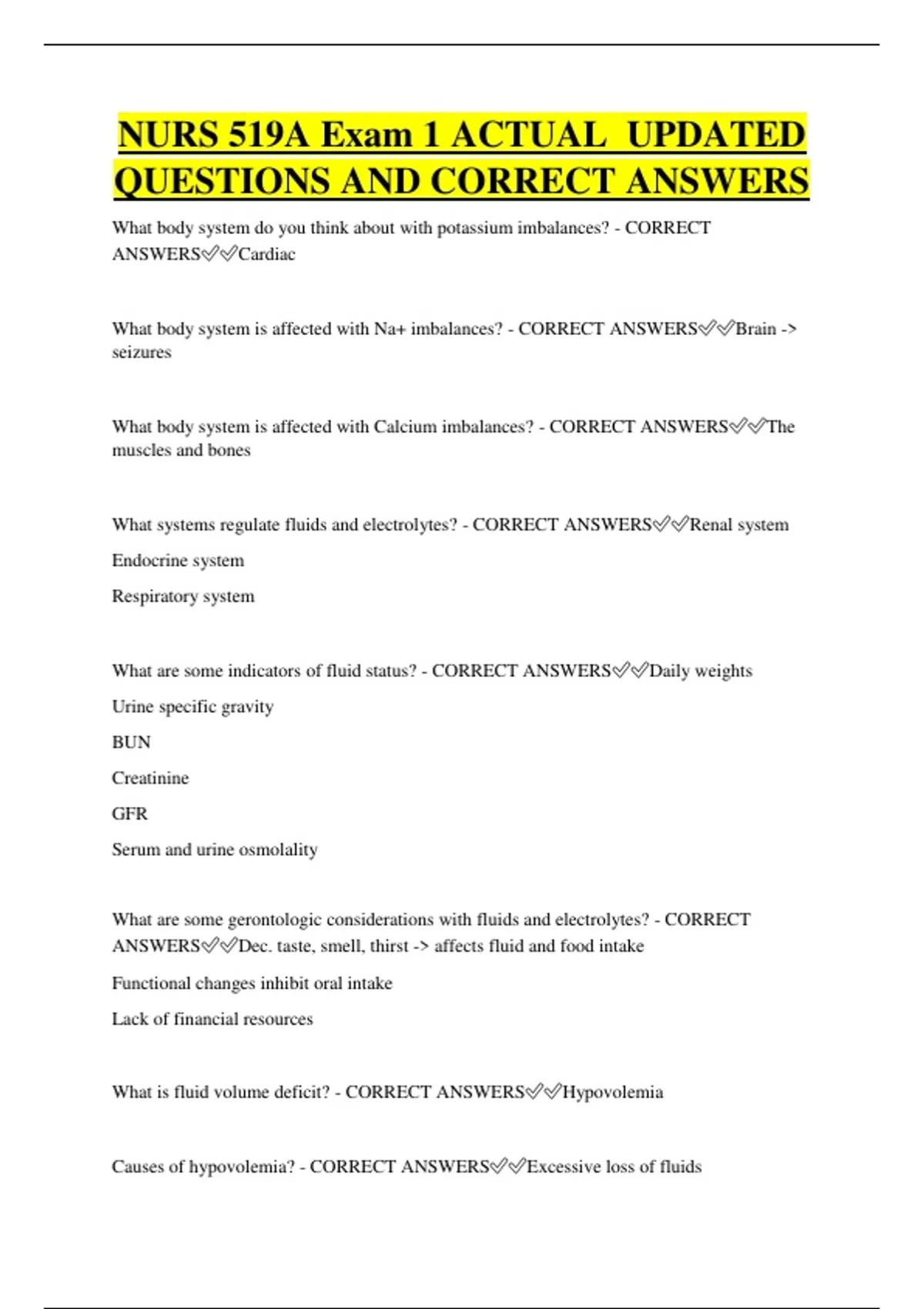 NURS 519A Exam 1 ACTUAL UPDATED QUESTIONS AND CORRECT ANSWERS What body system do you think about with potassium imbalances? - CORRECT ANSWERSCardiac What body system is affected with Na+ imbalances? - CORRECT ANSWERSBrain -> seizures What body system is affected with Calcium imbalances? - CORRECT ANSWERSThe muscles and bones What systems regulate fluids and electrolytes? - CORRECT ANSWERSRenal system Endocrine system Respiratory system What are some indicators of fluid status? - CORRECT ANSWERSDaily weights Urine specific gravity BUN Creatinine GFR Serum and urine osmolality What are some gerontologic considerations with fluids and electrolytes? - CORRECT ANSWERSDec. taste, smell, thirst -> affects fluid and food intake Functional changes inhibit oral intake Lack of financial resources What is fluid volume deficit? - CORRECT ANSWERSHypovolemia Causes of hypovolemia? - CORRECT ANSWERSExcessive loss of fluids Insufficient intake of fluids Fluid shifts GI causes (vomiting, diarrhea, NG tube) Clinical manifestations of hypovolemia - CORRECT ANSWERSDry mucous membranes Poor skin turgor thirst Weight loss Weak peripheral pulses Changes in lab values (Na+, K+, H/H, BUN/Cr,) Anxiety Cool, clammy hands What is hypervolemia? What causes it? - CORRECT ANSWERS