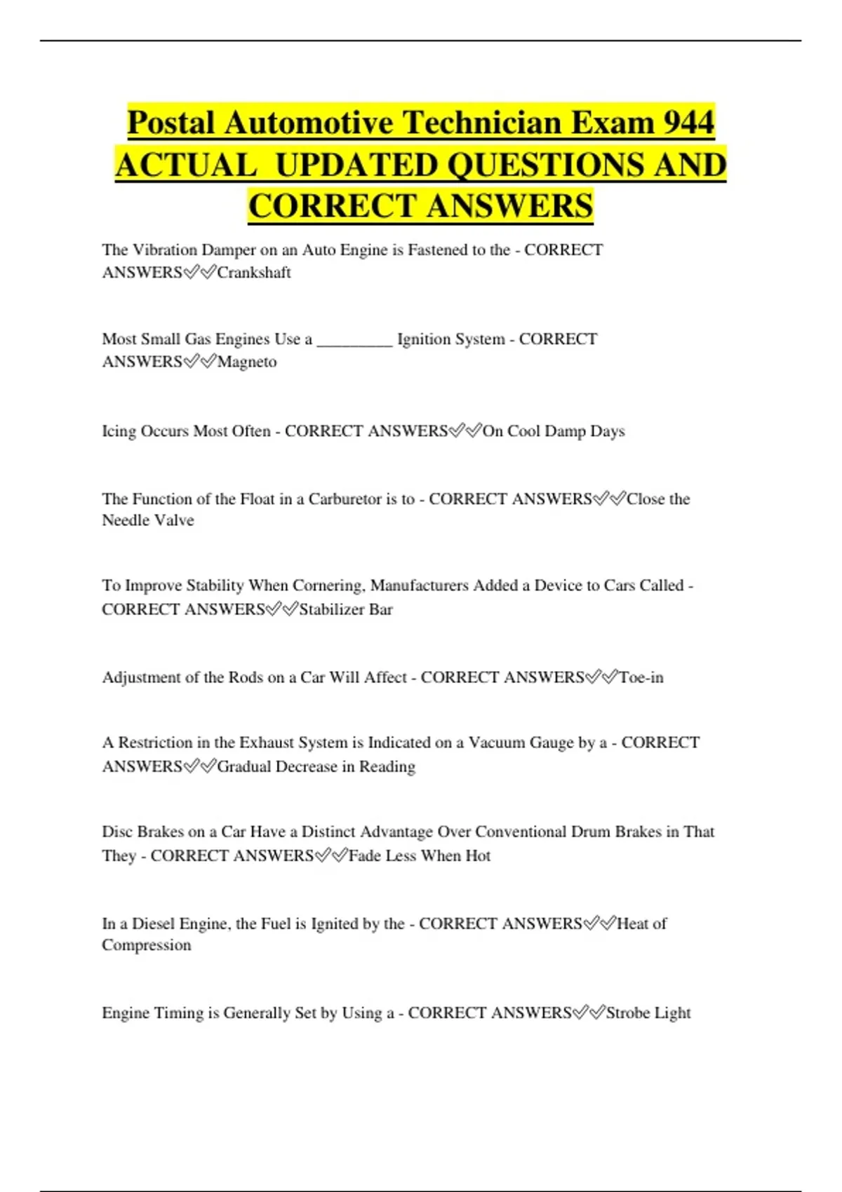 Engine Timing is Generally Set by Using a - CORRECT ANSWERS✅✅Strobe Light