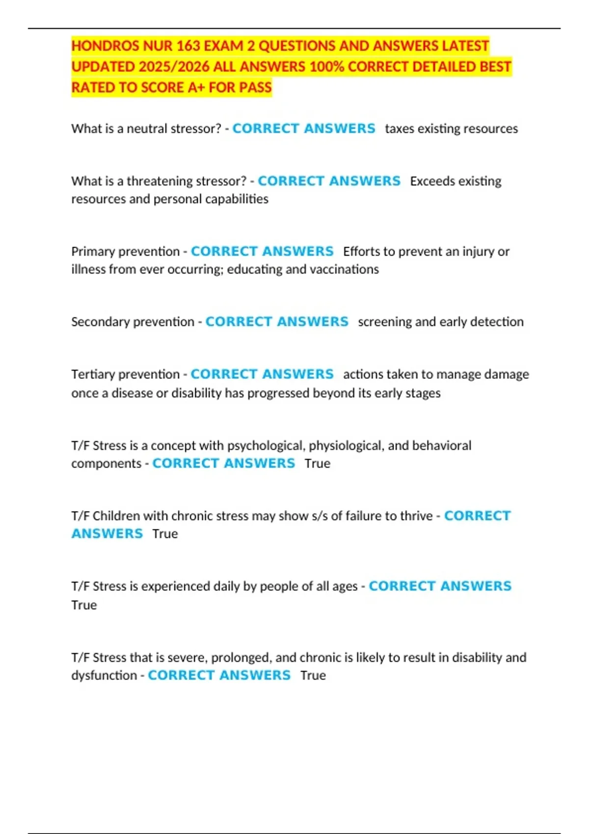 HONDROS NUR 163 EXAM 2 QUESTIONS AND ANSWERS LATEST UPDATED 2025/2026 ALL ANSWERS 100% CORRECT DETAILED BEST RATED TO SCORE A+ FOR PASS