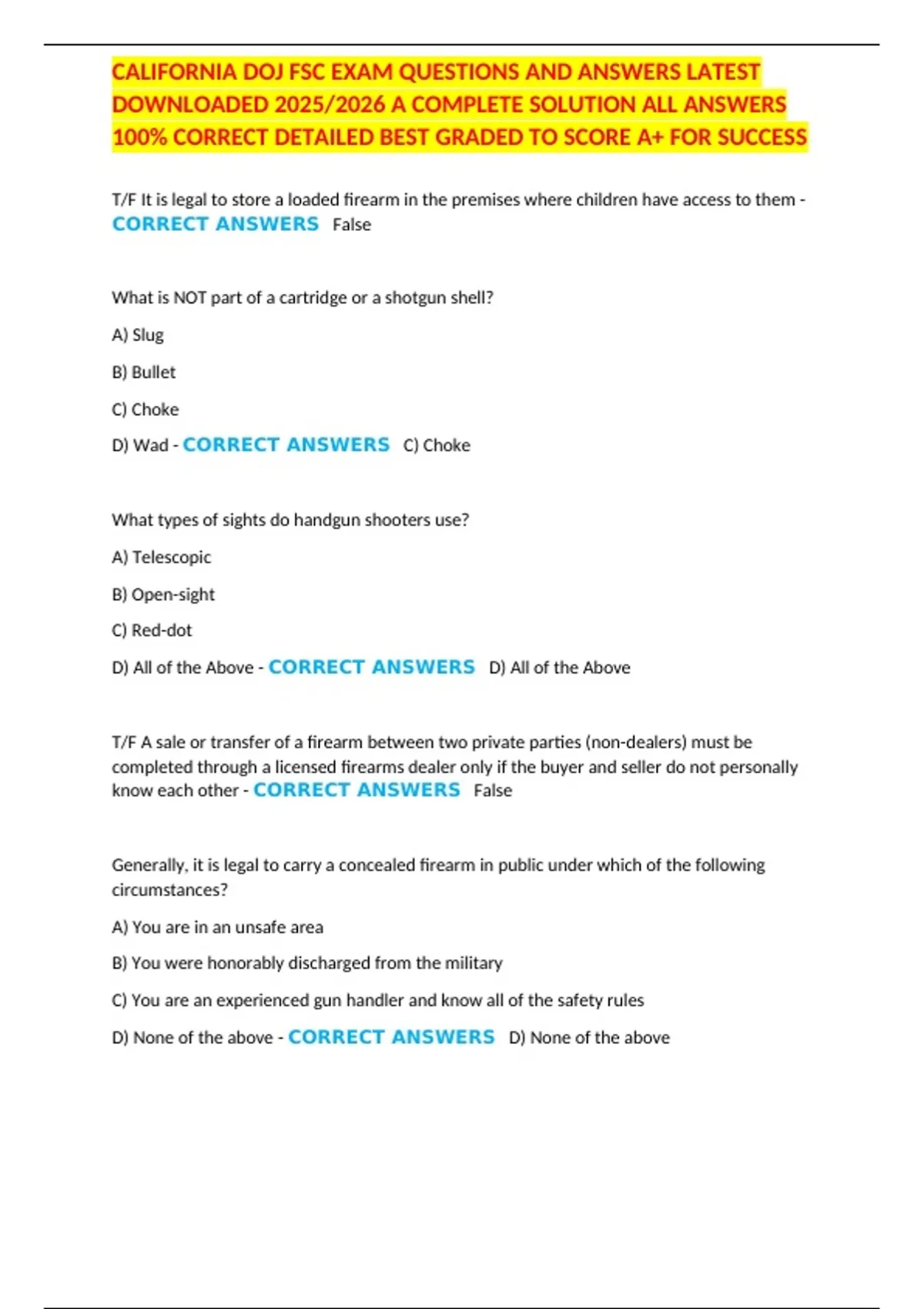 CALIFORNIA DOJ FSC EXAM QUESTIONS AND ANSWERS LATEST