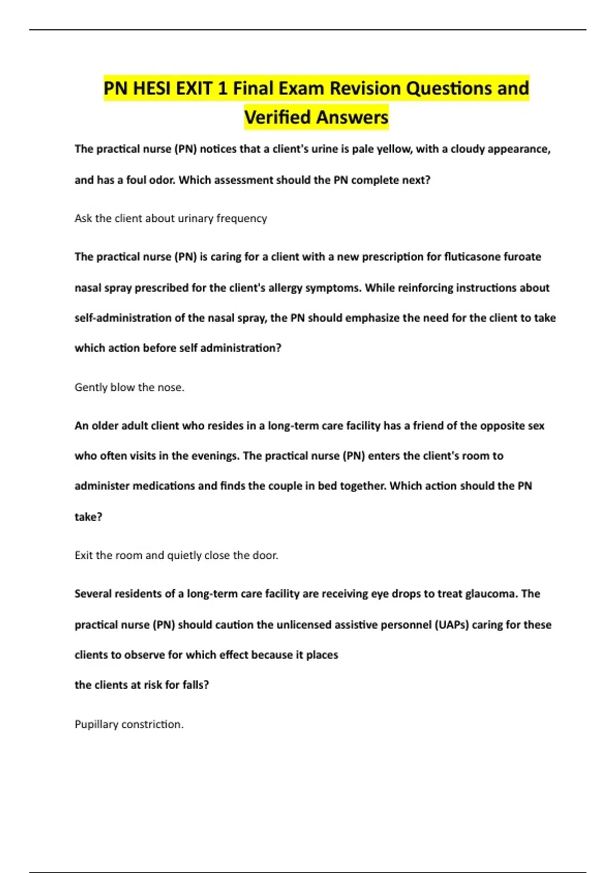 PN HESI EXIT 1 Final Exam Revision Questions and Verified Answers