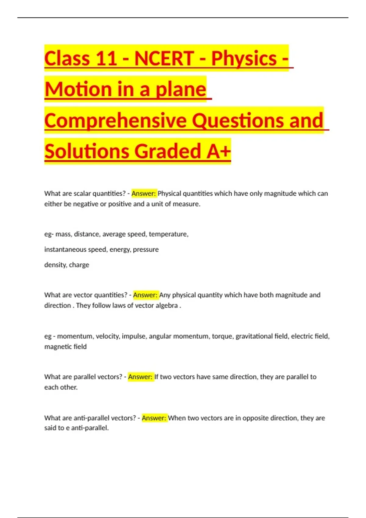 Class 11 - NCERT - Physics - Motion in a plane Comprehensive Questions and Solutions Graded A+