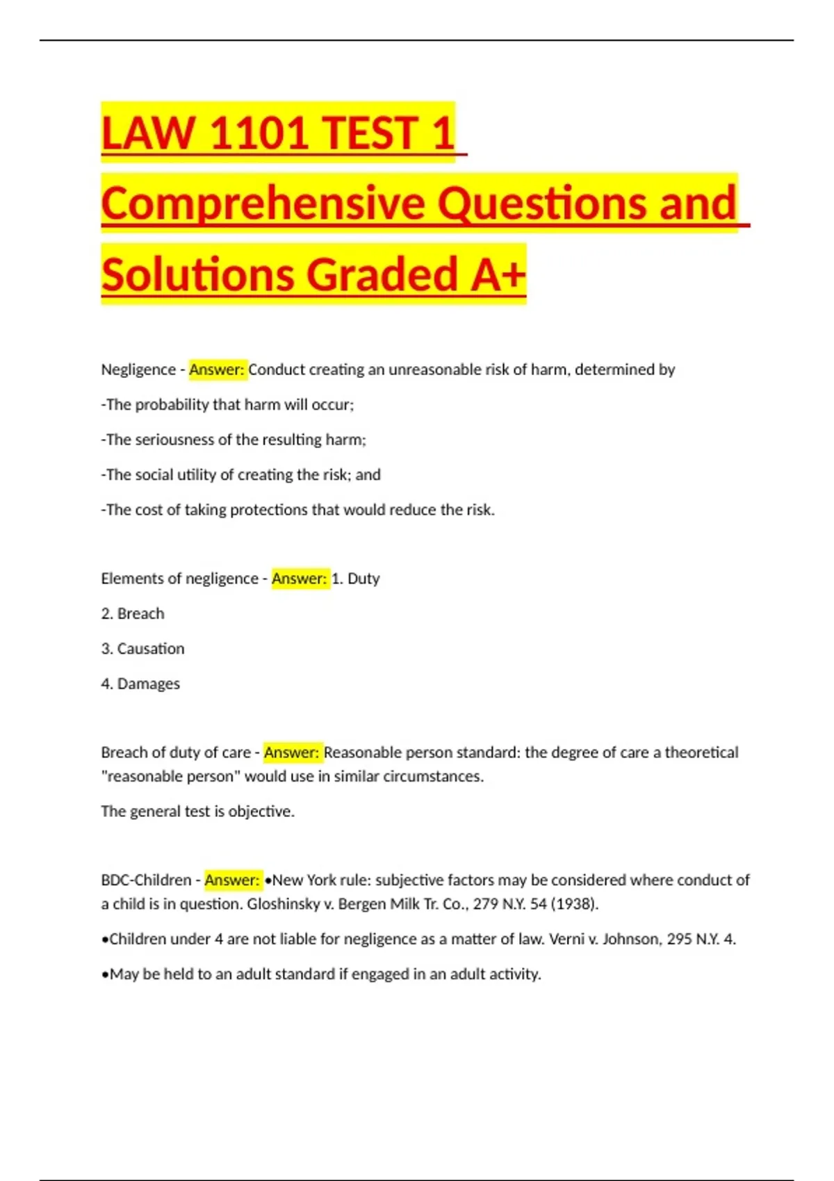 LAW 1101 TEST 1 Comprehensive Questions and Solutions Graded A+