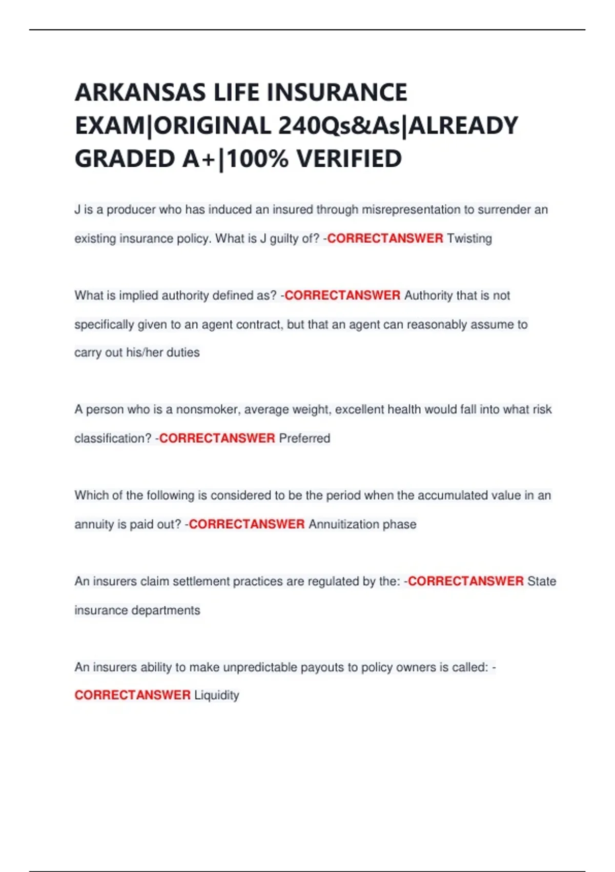 ARKANSAS LIFE INSURANCE EXAM|ORIGINAL 240Qs&As|ALREADY GRADED A+|100% VERIFIED