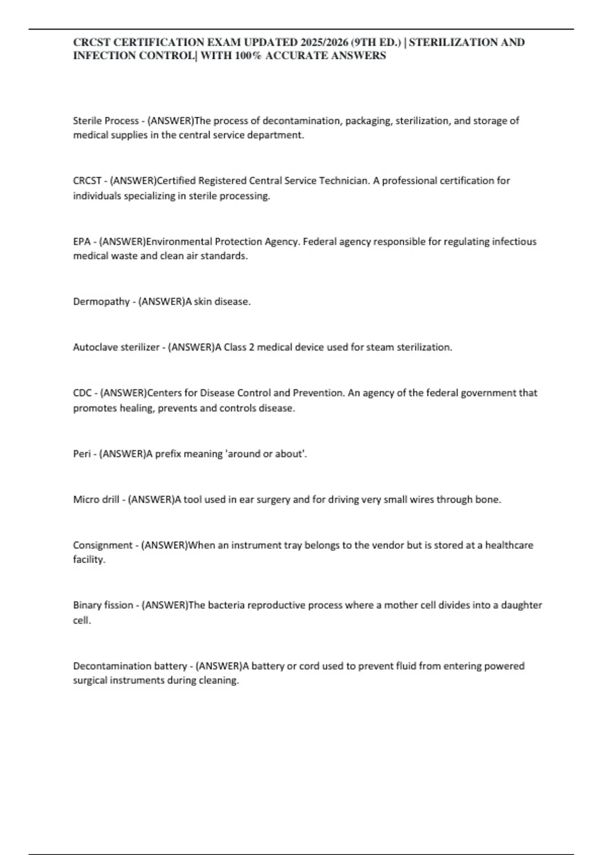 , CRCST CERTIFICATION EXAM UPDATED 2025/2026 (9TH ED.) | STERILIZATION AND