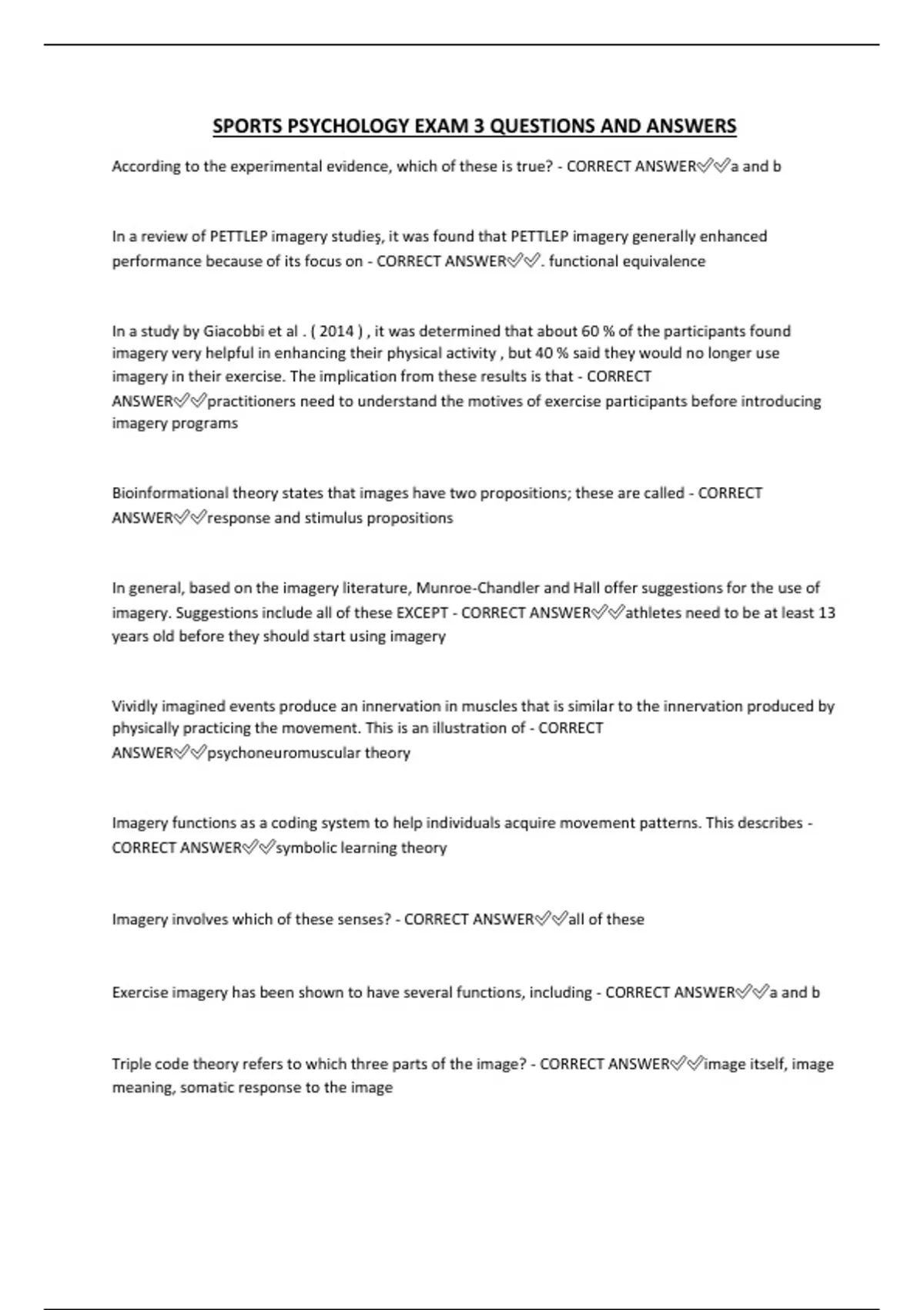 SPORTS PSYCHOLOGY EXAM 3 QUESTIONS AND ANSWERS According to the experimental evidence, which of these is true? - CORRECT ANSWERa and b In a review of PETTLEP imagery studieş, it was found that PETTLEP imagery generally enhanced performance because of its focus on - CORRECT ANSWER. functional equivalence