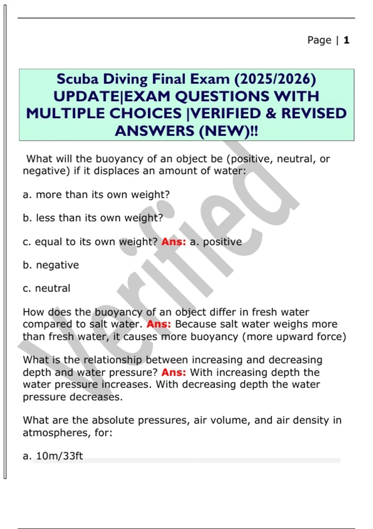 Scuba Diving Final Exam (2025/2026) UPDATE|EXAM QUESTIONS WITH MULTIPLE CHOICES |VERIFIED & REVISED ANSWERS (NEW)!!