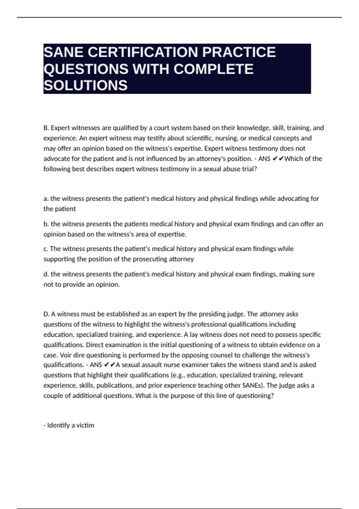 qualifications. - ANS ✔✔A sexual assault nurse examiner takes the witness stand and is asked