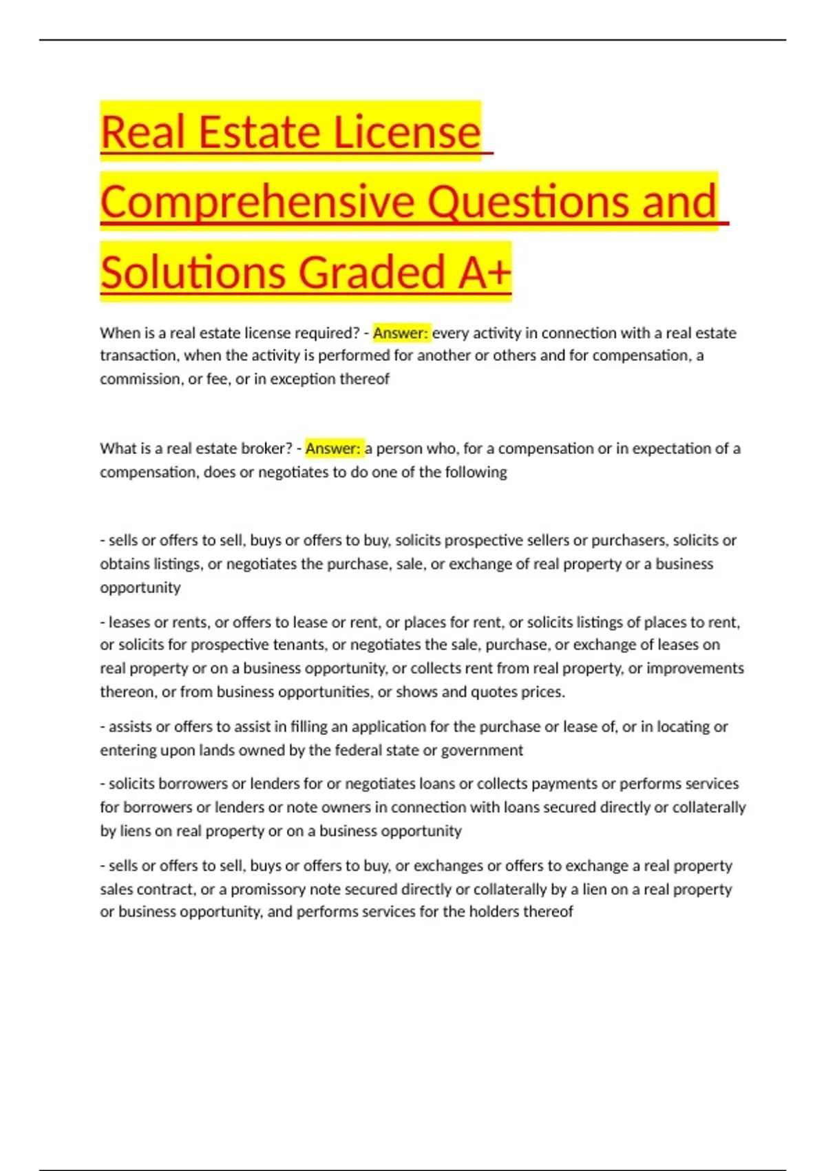 Real Estate License Comprehensive Questions and Solutions Graded A+