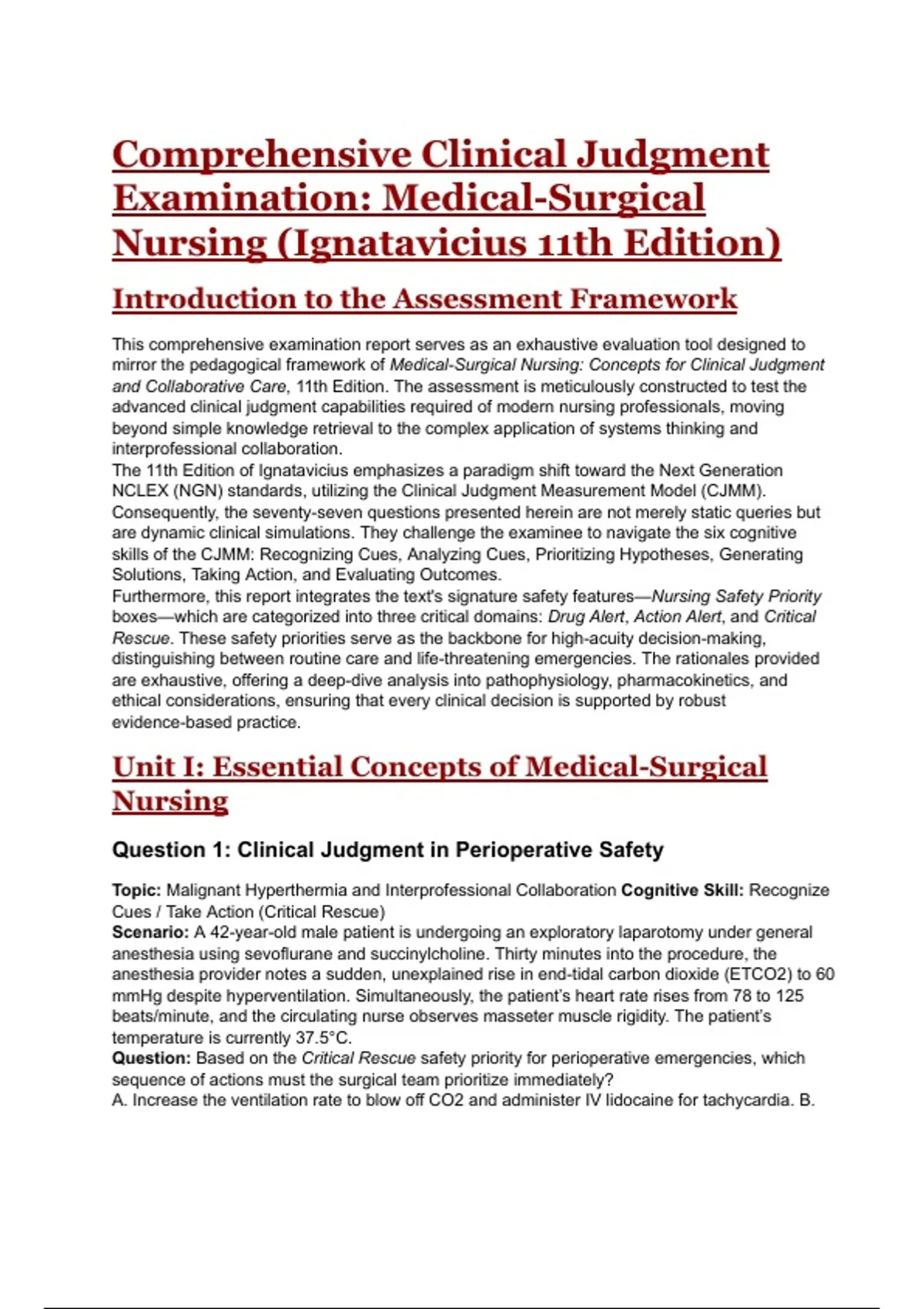This document provides a fully developed Medical-Surgical Nursing examination aligned with the Ignatavicius, Workman & Rebar – 11th Edition framework, focusing on Clinical Judgment and Next-Generation NCLEX (NGN) competencies. It covers 25+ core topics including perioperative safety, emergency care, fluid and electrolyte balance, cardiovascular, respiratory, neurological, endocrine, renal, and musculoskeletal conditions. It includes detailed rationales, pathophysiology explanations, safety alerts, drug alerts, and NGN-style reasoning. The material is suitable for exam preparation, nursing review courses, and practice in clinical judgment skills.