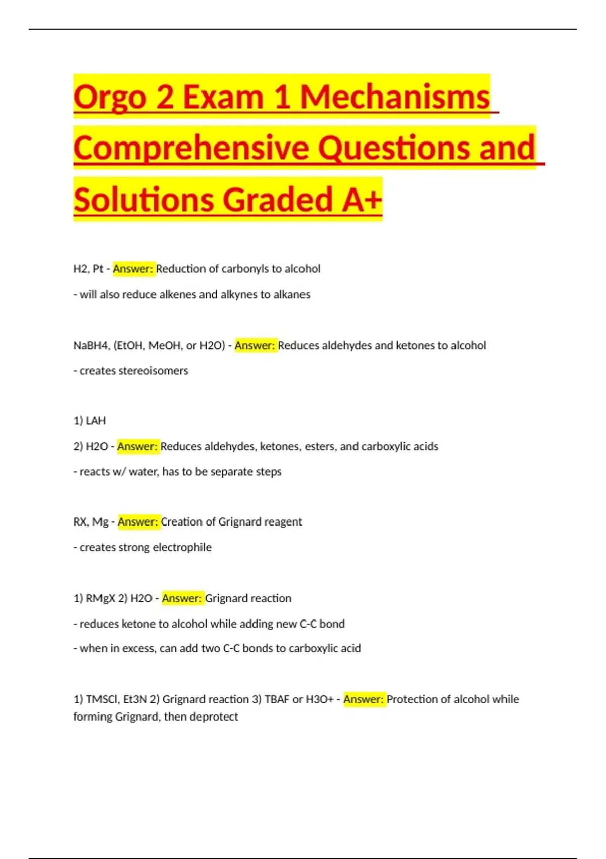Orgo 2 Exam 1 Mechanisms Comprehensive Questions and Solutions Graded A+