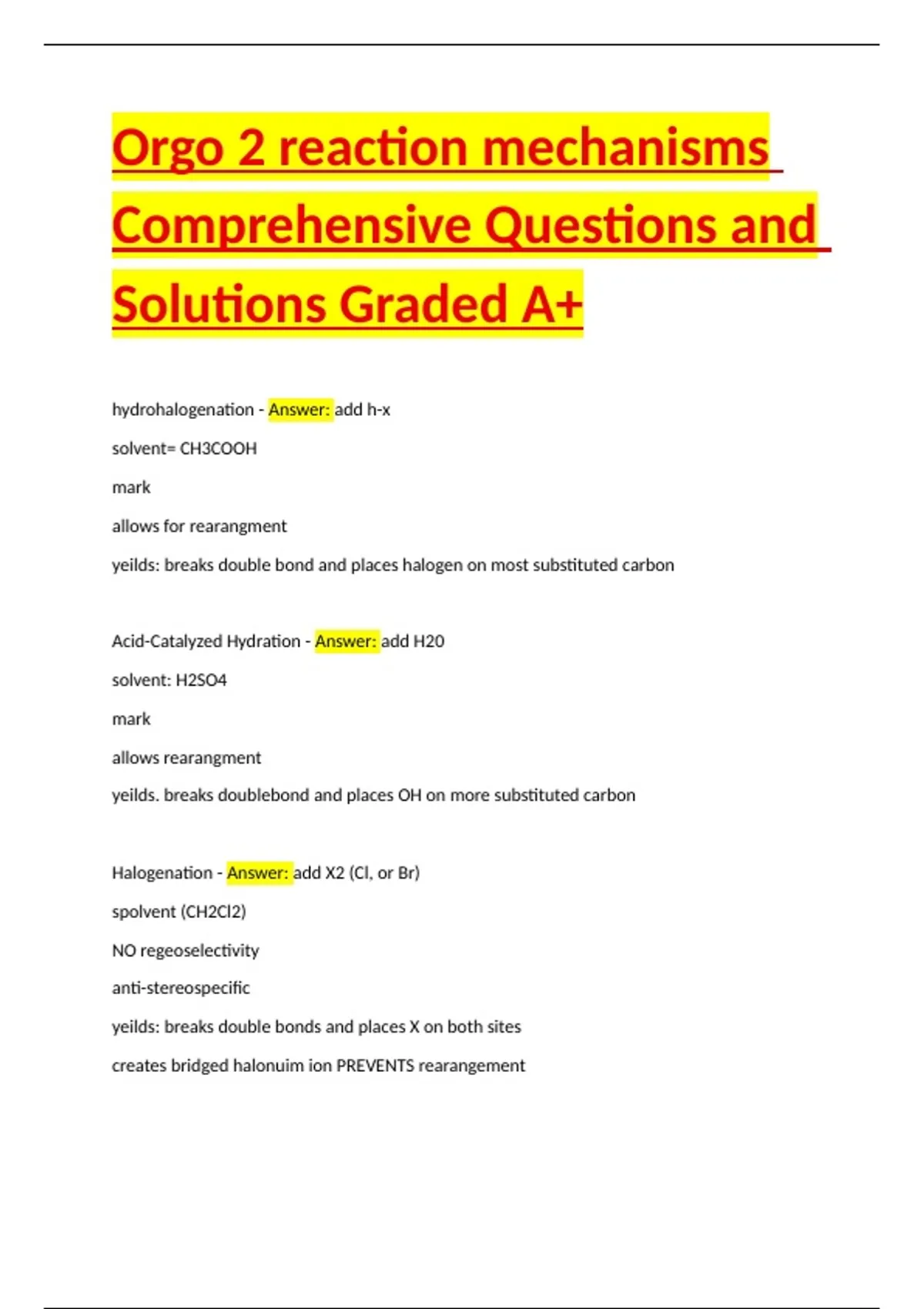 Orgo 2 reaction mechanisms Comprehensive Questions and Solutions Graded A+
