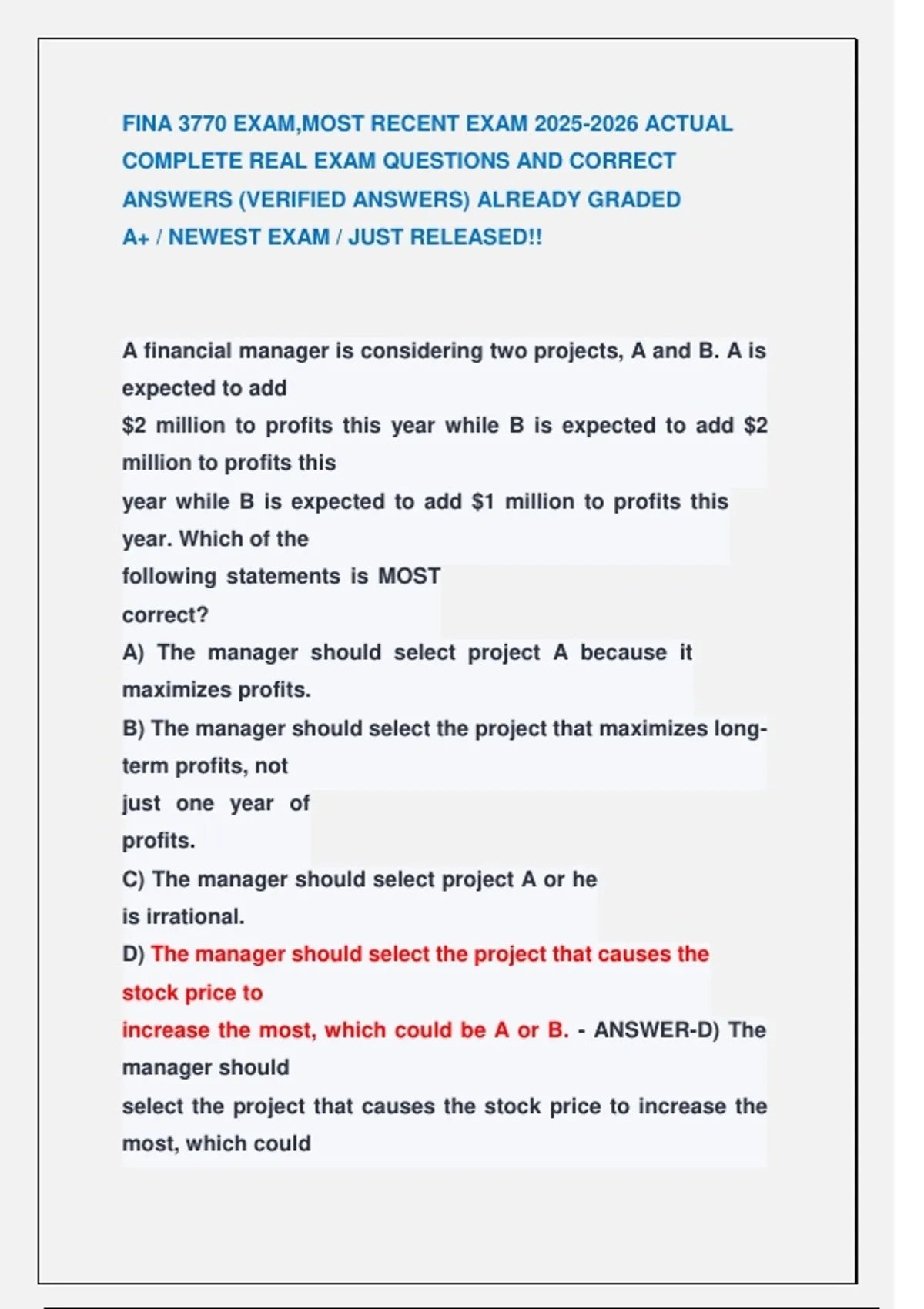 D) maximizing stockholders equity. - ANSWER-C) maximizing