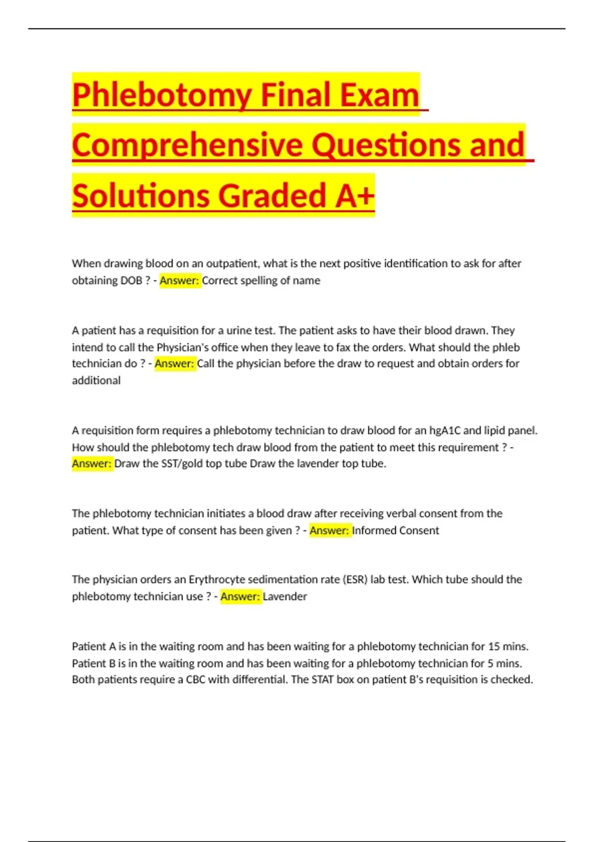 ,What should the phlebotomy technician do first ? - Answer: Draw blood from Patient B using a