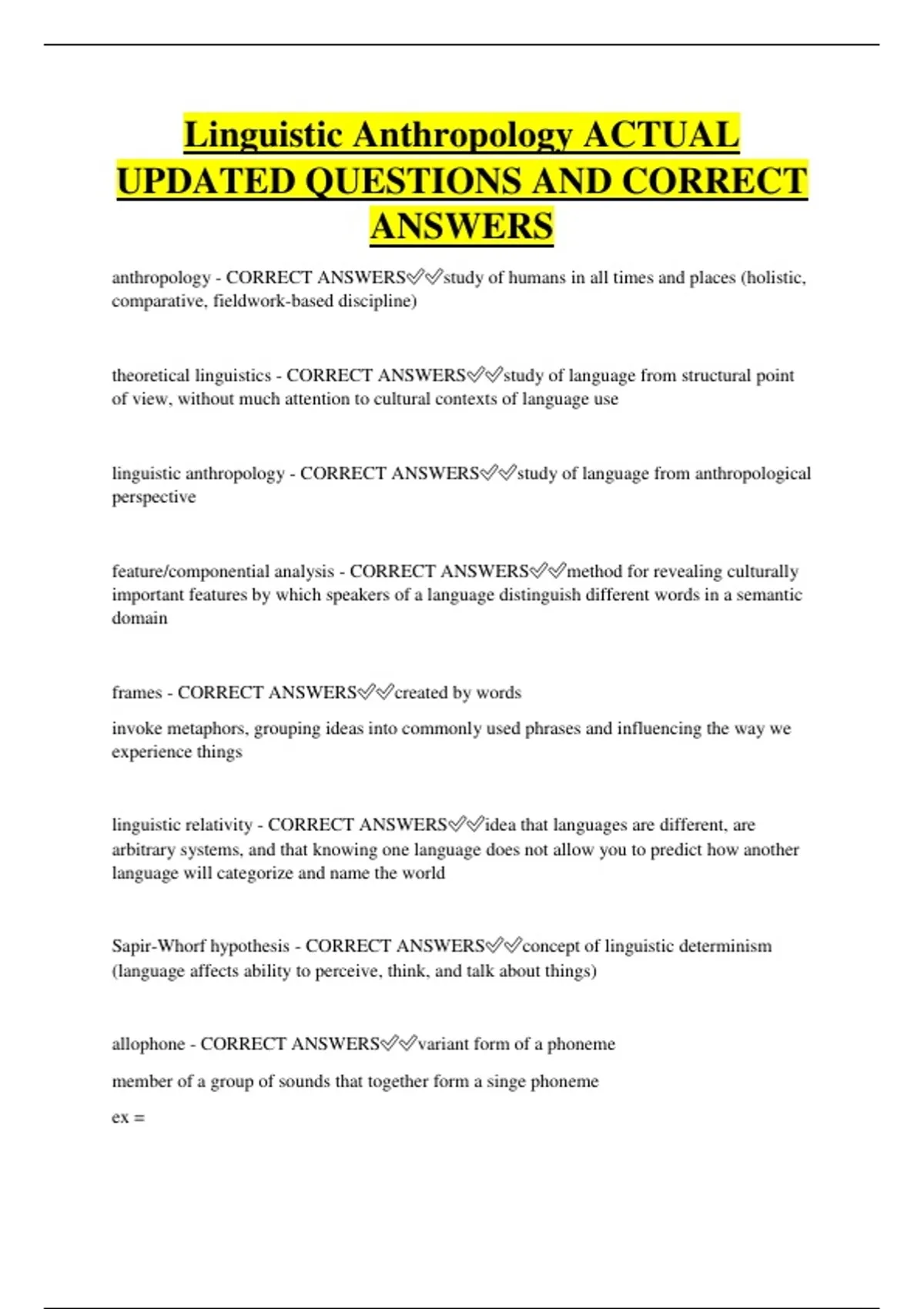 linguistic anthropology - CORRECT ANSWERS✅✅study of language from anthropological