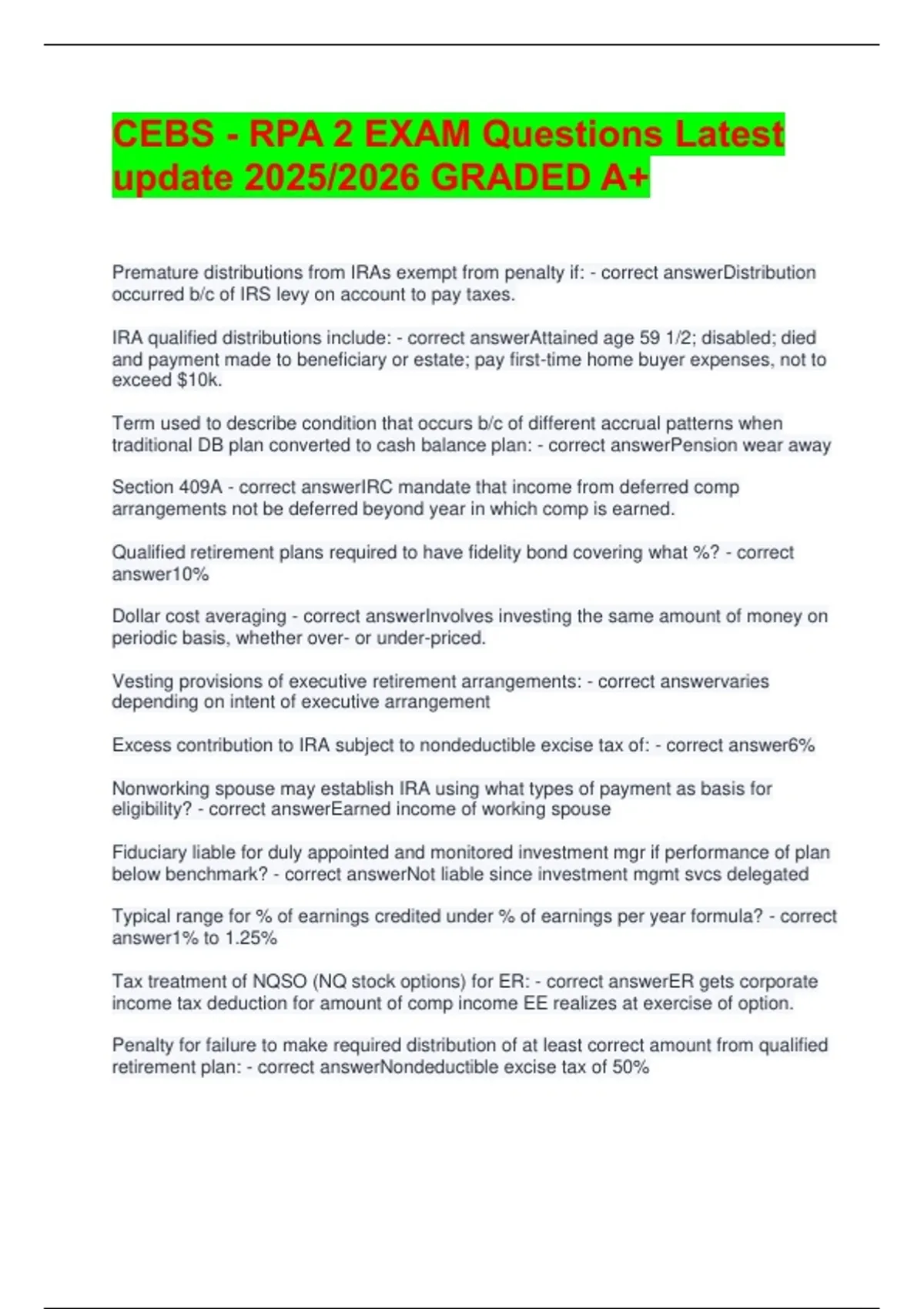 Prepare with confidence using this CEBS – RPA 2 Exam Questions Pack, fully updated for the 2025/2026 exam cycle and graded A+ for accuracy. This resource is designed to help you master every major RPA 2 concept, strengthen your retirement plan knowledge, and pass your CEBS exam on the first attempt. What’s Inside: Fully updated 2025/2026 RPA 2 exam questions Verified correct answers (A+ accuracy) Covers all key RPA 2 domains, including: • Retirement plan design • Pension funding & actuarial principles • Regulatory compliance • Employee benefits administration • Financial and plan management strategies Clear and exam-focused explanations Excellent for quick review, deep study, or last-minute prep Perfect for CEBS exam candidates seeking high-scoring results This is the ultimate resource to accelerate your CEBS RPA 2 success—updated, reliable, and built for guaranteed performance.