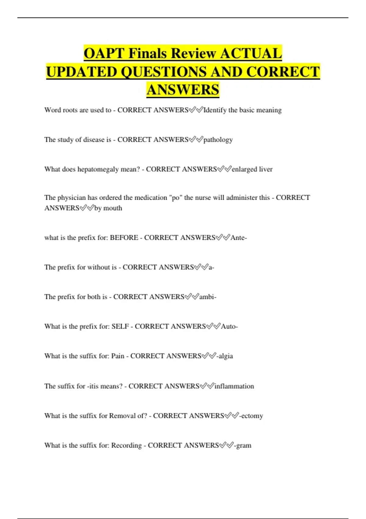 OAPT Finals Review ACTUAL UPDATED QUESTIONS AND CORRECT ANSWERS Word roots are used to - CORRECT ANSWERSIdentify the basic meaning The study of disease is - CORRECT ANSWERSpathology What does hepatomegaly mean? - CORRECT ANSWERSenlarged liver The physician has ordered the medication "po" the nurse will administer this - CORRECT ANSWERSby mouth what is the prefix for: BEFORE - CORRECT ANSWERSAnte- The prefix for without is - CORRECT ANSWERSa- The prefix for both is - CORRECT ANSWERSambi- What is the prefix for: SELF - CORRECT ANSWERSAuto- What is the suffix for: Pain - CORRECT ANSWERS-algia The suffix for -itis means? - CORRECT ANSWERSinflammation What is the suffix for Removal of? - CORRECT ANSWERS-ectomy What is the suffix for: Recording - CORRECT ANSWERS-gram Cells do NOT include which of the following? - CORRECT ANSWERS