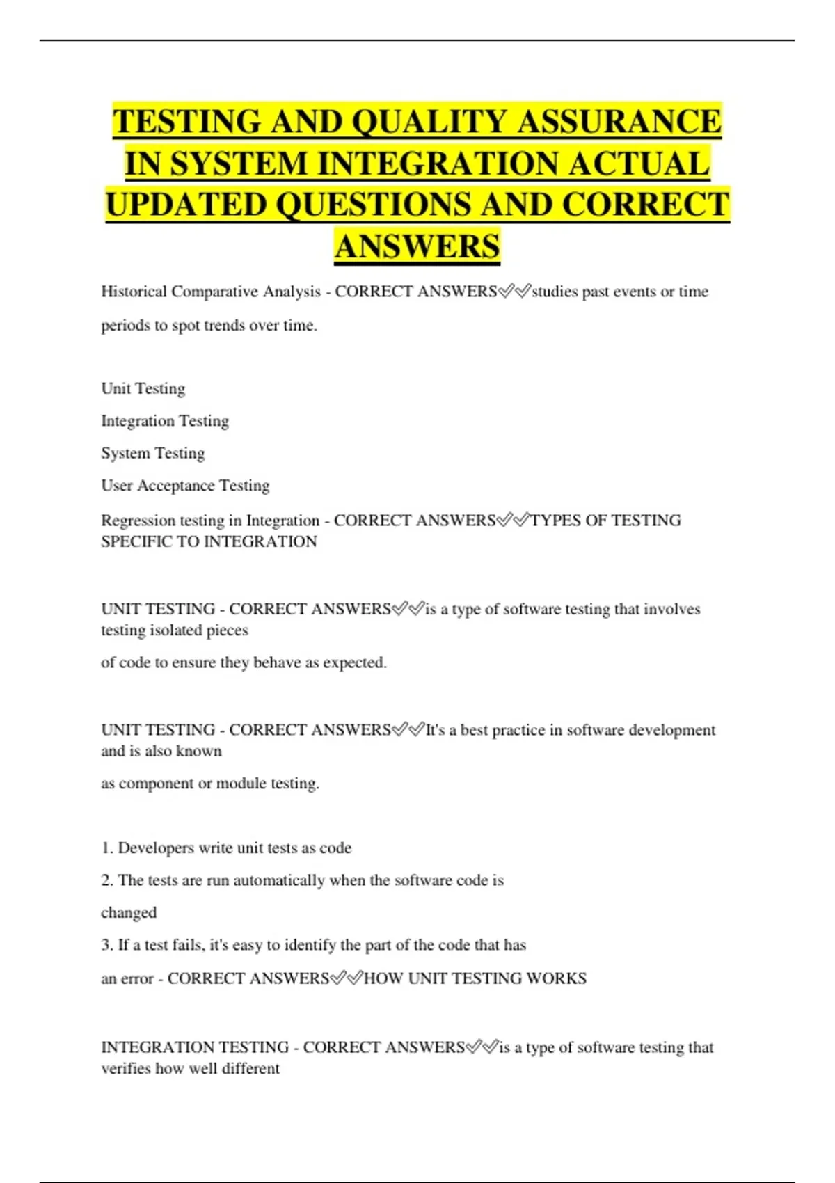 TESTING AND QUALITY ASSURANCE IN SYSTEM INTEGRATION ACTUAL UPDATED QUESTIONS AND CORRECT ANSWERS Historical Comparative Analysis - CORRECT ANSWERSstudies past events or time periods to spot trends over time. Unit Testing Integration Testing System Testing User Acceptance Testing Regression testing in Integration - CORRECT ANSWERSTYPES OF TESTING SPECIFIC TO INTEGRATION UNIT TESTING - CORRECT ANSWERSis a type of software testing that involves testing isolated pieces of code to ensure they behave as expected. UNIT TESTING - CORRECT ANSWERSIt's a best practice in software development and is also known as component or module testing. 1. Developers write unit tests as code 2. The tests are run automatically when the software code is changed 3. If a test fails, it's easy to identify the part of the code that has an error - CORRECT ANSWERSHOW UNIT TESTING WORKS INTEGRATION TESTING - CORRECT ANSWERSis a type of software testing that verifies how well different components of a software application work together. INTEGRATION TESTING - CORRECT ANSWERSIt's a key step in the development process and is usually performed after unit testing and before system testing. Big-bang Top-Down Bottom-Up - CORRECT ANSWERSTYPES OF INTEGRATION SYSTEM