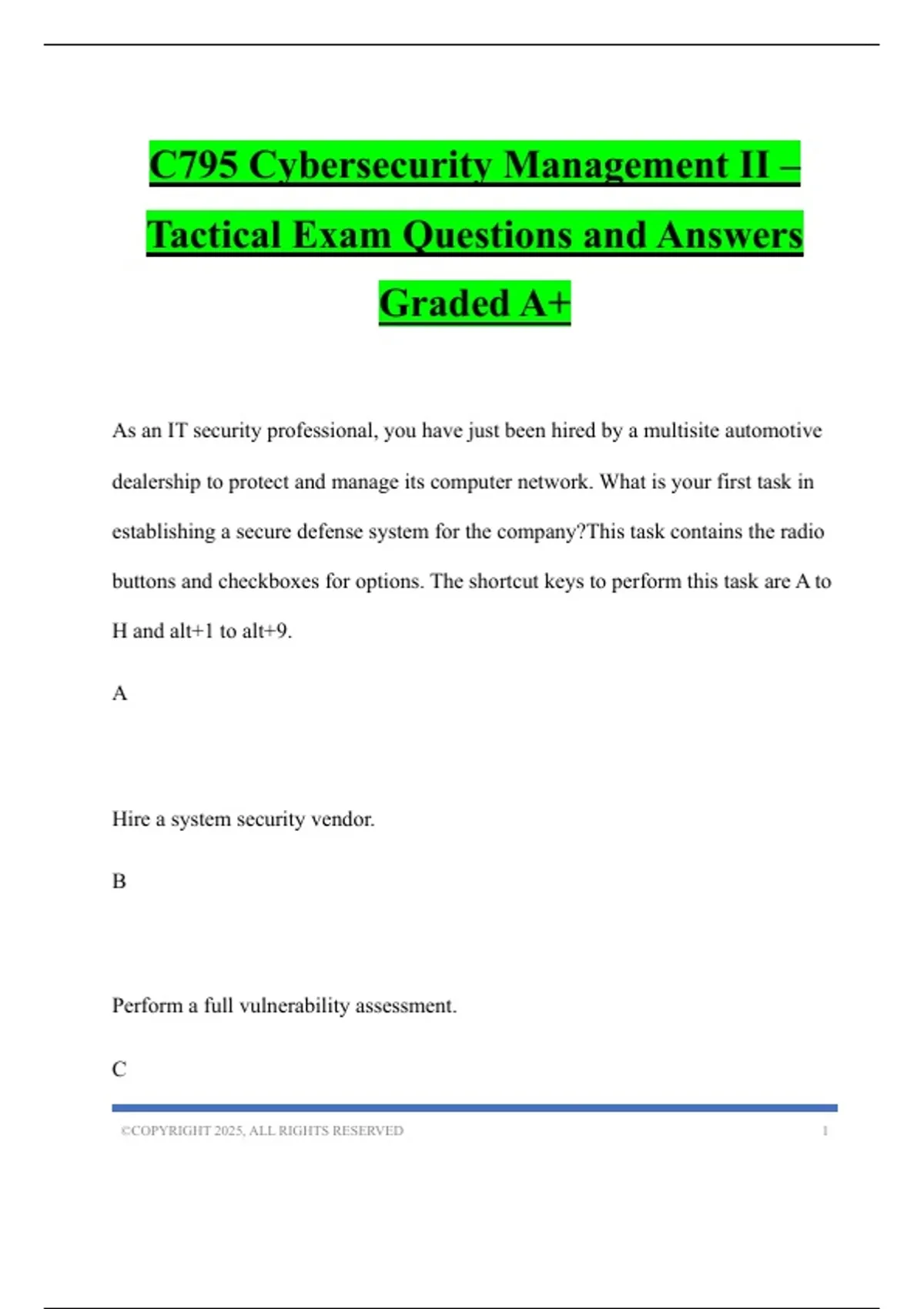 C795 Cybersecurity Management II – Tactical Exam Questions and Answers Graded A+