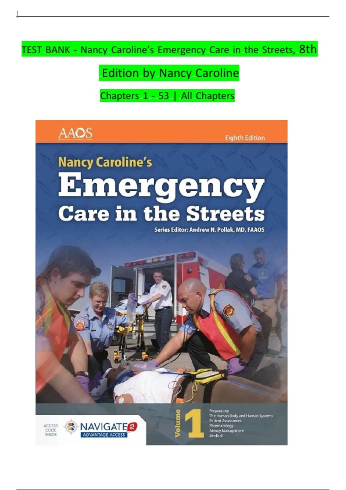 Test Bank - Nancy Caroline’s Emergency Care in the Streets, 8th Edition (Pollak, 2018), Chapter 1-53 | All Chapters