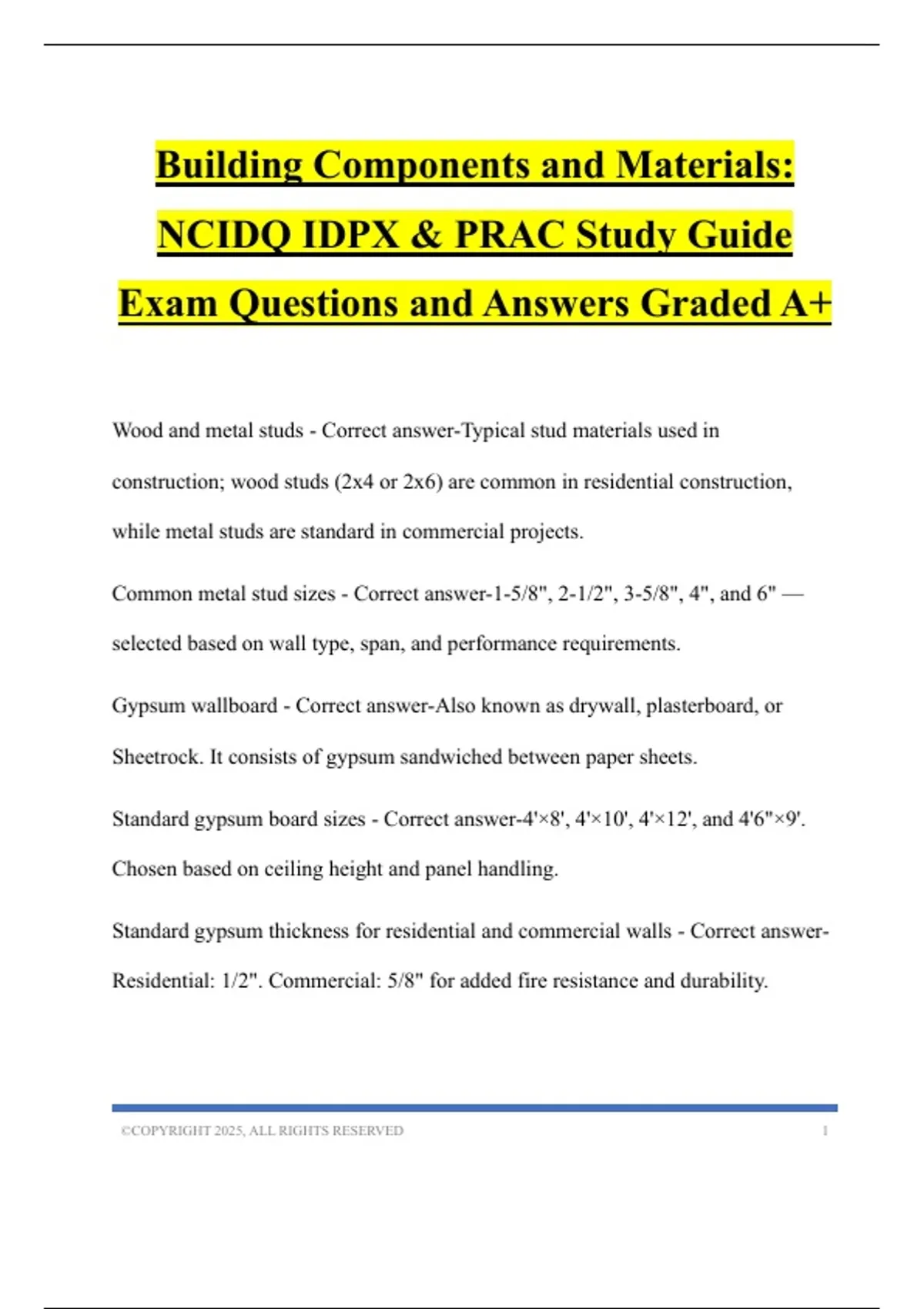 Building Components and Materials: NCIDQ IDPX & PRAC Study Guide Exam Questions and Answers Graded A+