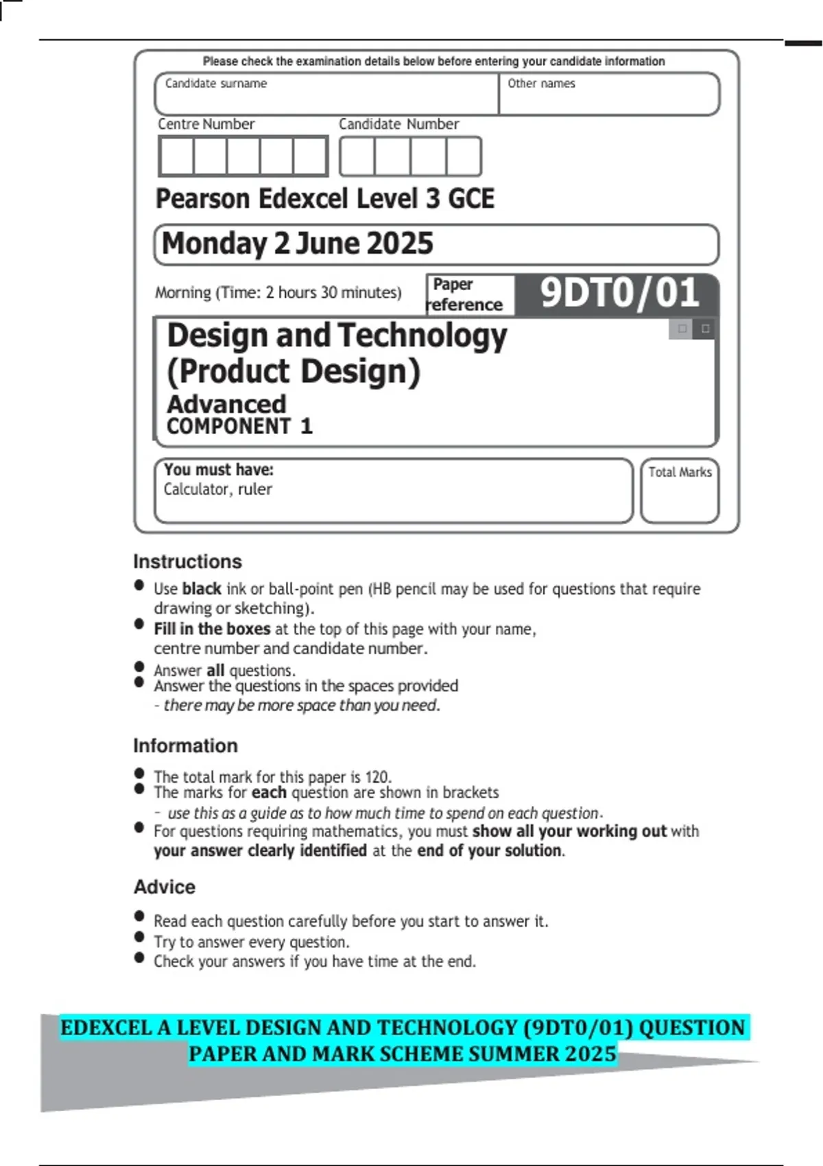 EDEXCEL A LEVEL DESIGN AND TECHNOLOGY (9DT0/01) QUESTION PAPER AND MARK SCHEME SUMMER 2025