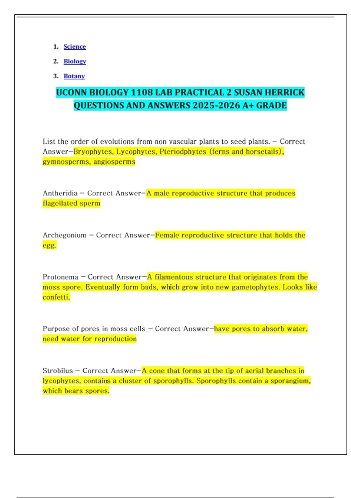 UCONN BIOLOGY 1108 LAB PRACTICAL 2 SUSAN HERRICK QUESTIONS AND ANSWERS A+ GRADE