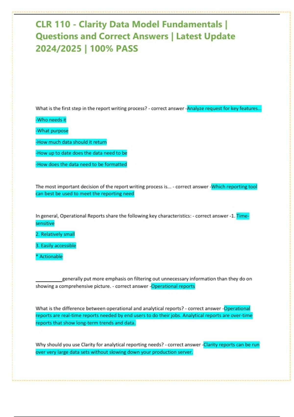 CLR 110 - Clarity Data Model Fundamentals | Questions and Correct Answers | Latest Update 2024/2025 | 100% PASS