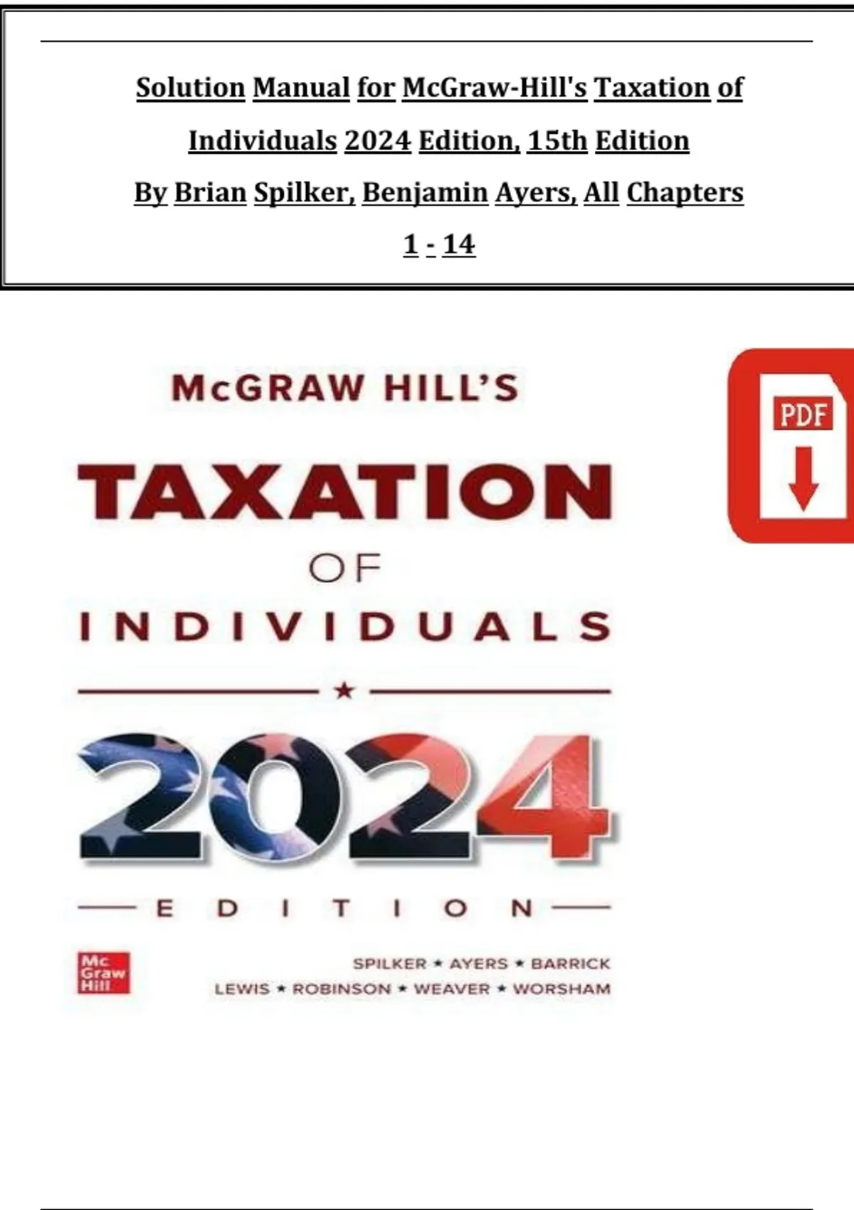 Master individual taxation with the 2025/2026 Solution Manual for McGraw-Hill's Taxation of Individuals, 15th Edition by Brian C. Spilker, Benjamin C. Ayers, and John Robinson. This comprehensive manual provides step-by-step solutions to all end-of-chapter problems, including detailed explanations of tax calculations, deductions, credits, and compliance principles. Ideal for accounting students, tax professionals, and exam candidates, it helps reinforce learning, improve problem-solving skills, and ensure accurate understanding of U.S. individual taxation rules for 2024.