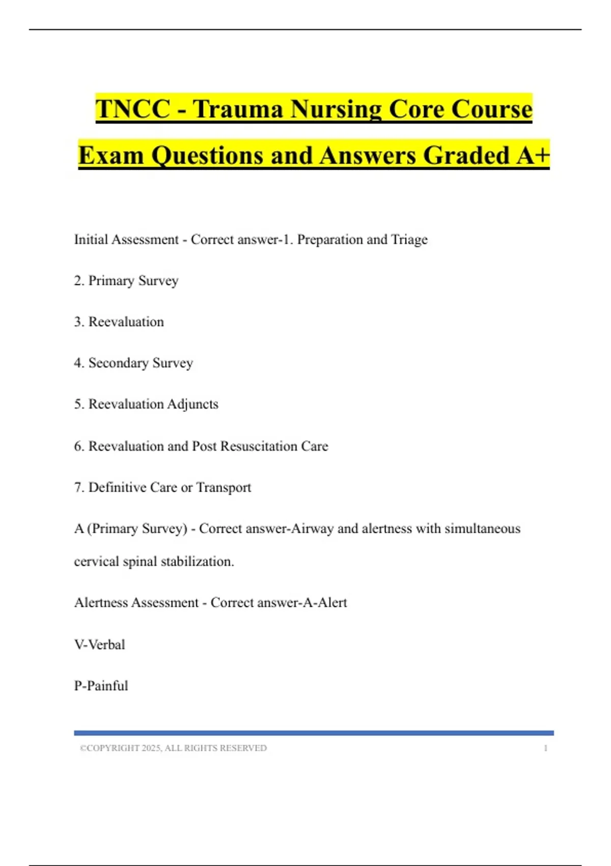 TNCC - Trauma Nursing Core Course Exam Questions and Answers Graded A+
