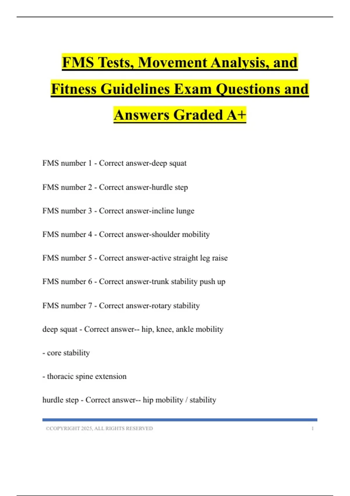 FMS Tests, Movement Analysis, and Fitness Guidelines Exam Questions and Answers Graded A+