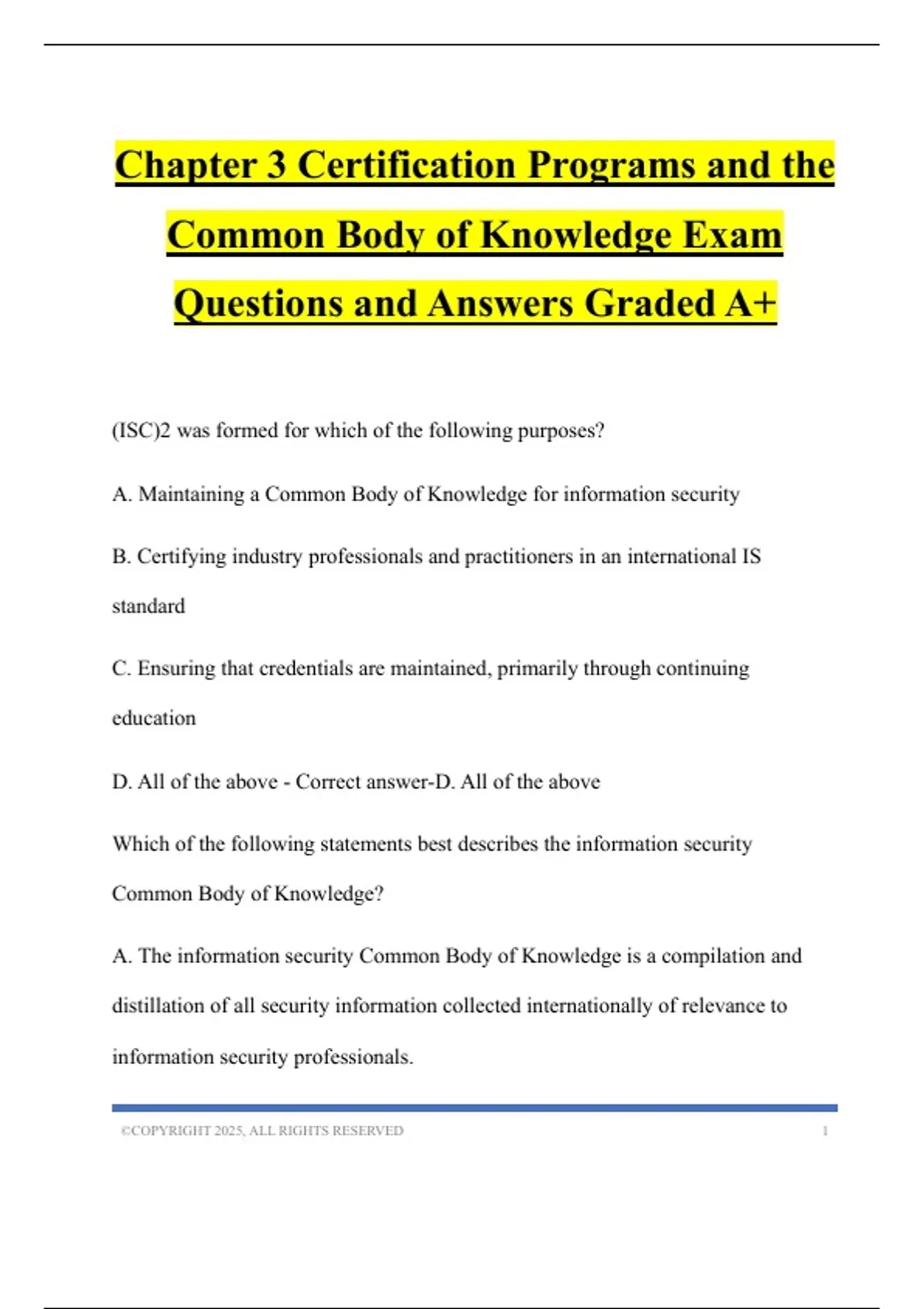 Chapter 3 Certification Programs and the Common Body of Knowledge Exam Questions and Answers Graded A+