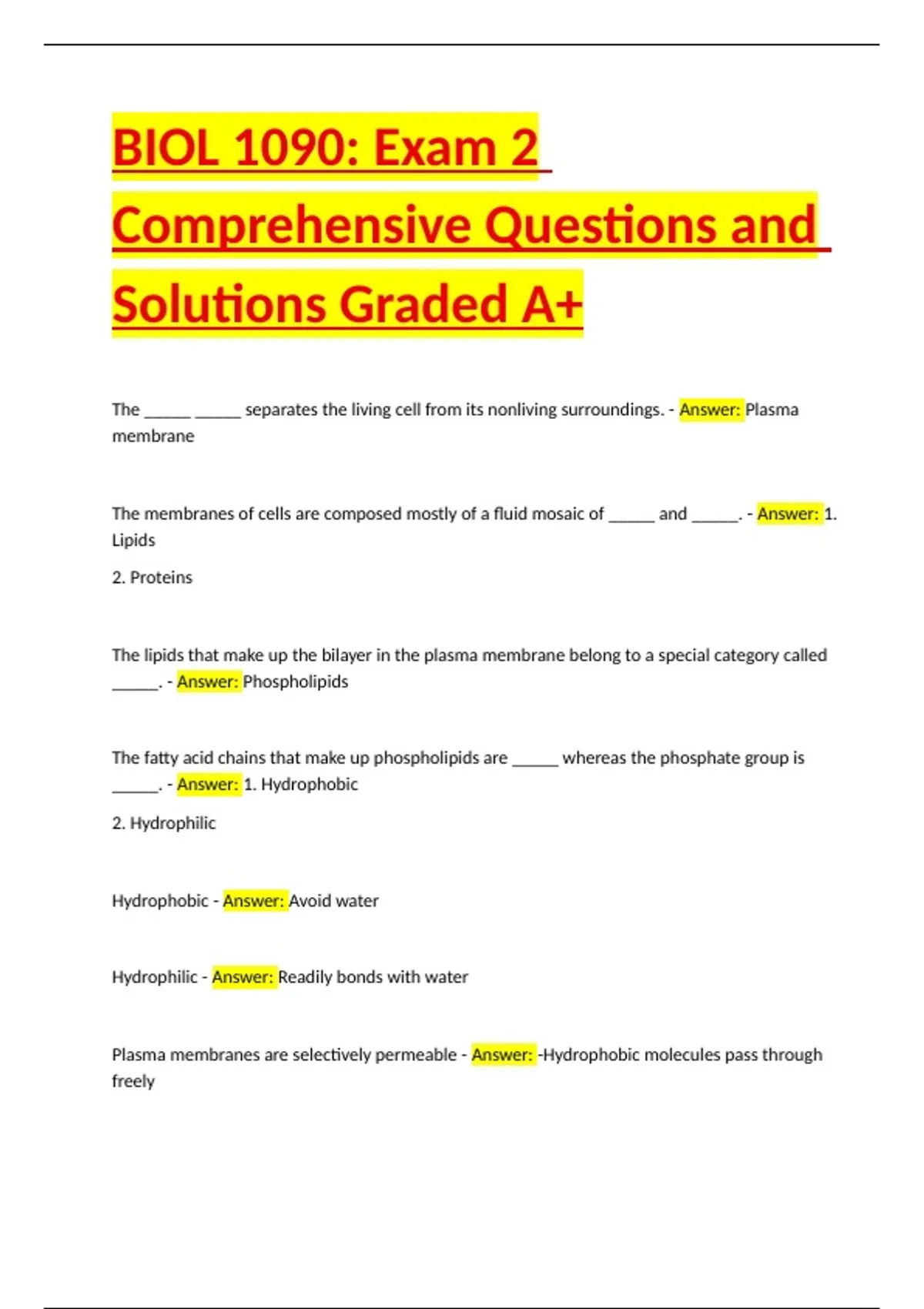 BIOL 1090 Exam 2 Comprehensive Questions and Solutions Graded A+