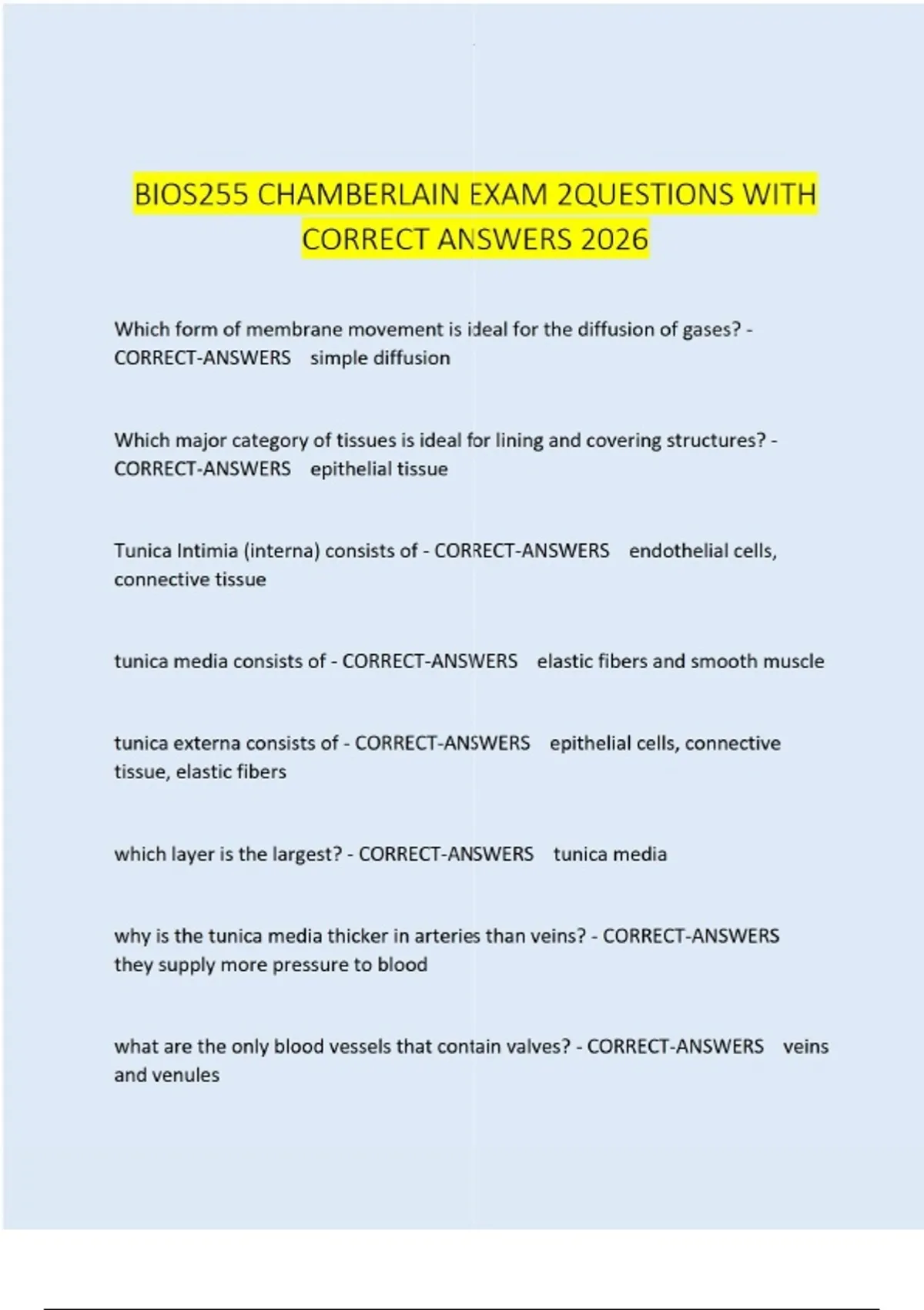 BIOS255 CHAMBERLAIN EXAM 2QUESTIONS WITH CORRECT ANSWERS 2026 Which form of membrane movement is ideal for the diffusion of gases? - CORRECT-ANSWERS simple diffusion Which major category of tissues is ideal for lining and covering structures? - CORRECT-ANSWERS epithelial tissue Tunica Intimia (interna) consists of - CORRECT-ANSWERS endothelial cells, connective tissue tunica media consists of - CORRECT-ANSWERS elastic fibers and smooth muscle tunica externa consists of - CORRECT-ANSWERS epithelial cells, connective