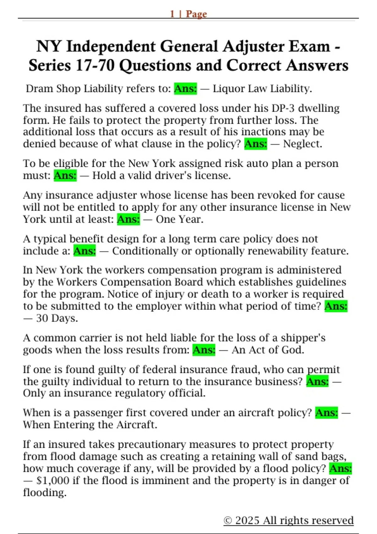 NY Independent General Adjuster Practice Exam Questions and Correct Answers NY Independent General Adjuster Practice Exam Questions and Correct Answers