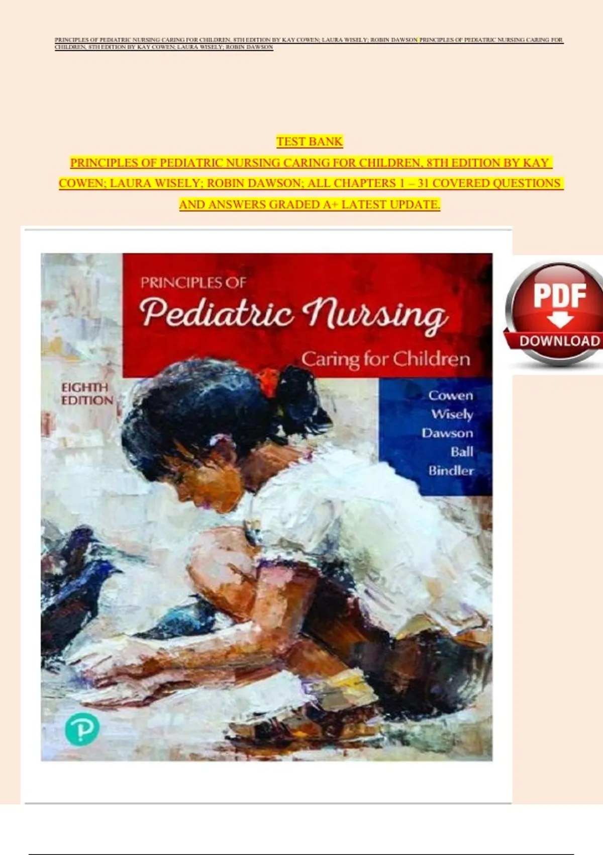 ,PRINCIPLES OF PEDIATRIC NURSING CARING FOR CHILDREN, 8TH EDITION BY KAY COWEN; LAURA WISELY; ROBIN DAWSON PRINCIPLES OF PEDIATRIC NURSING CARING FOR