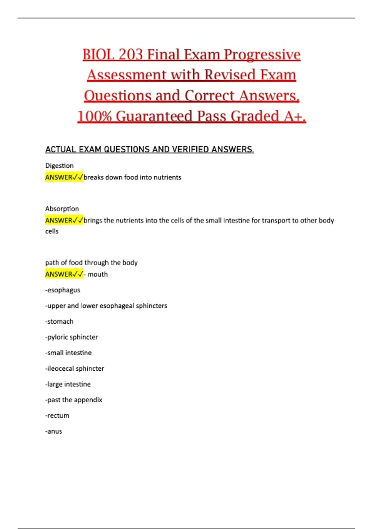 BIOL 203 – Final Exam Progressive Assessment with Revised Exam Questions and Correct Answers (Complete Exam Material)