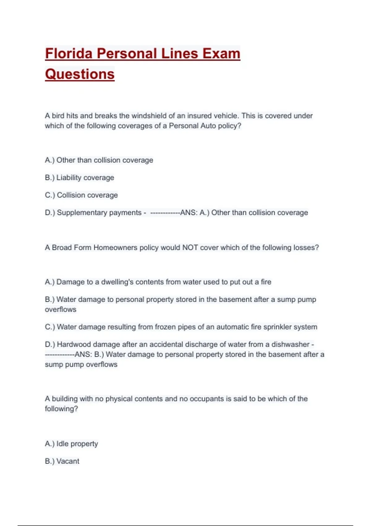Florida Personal Lines Exam Questions with correct Answers (A+ GRADED 100% VERIFIED)| 2025/2026