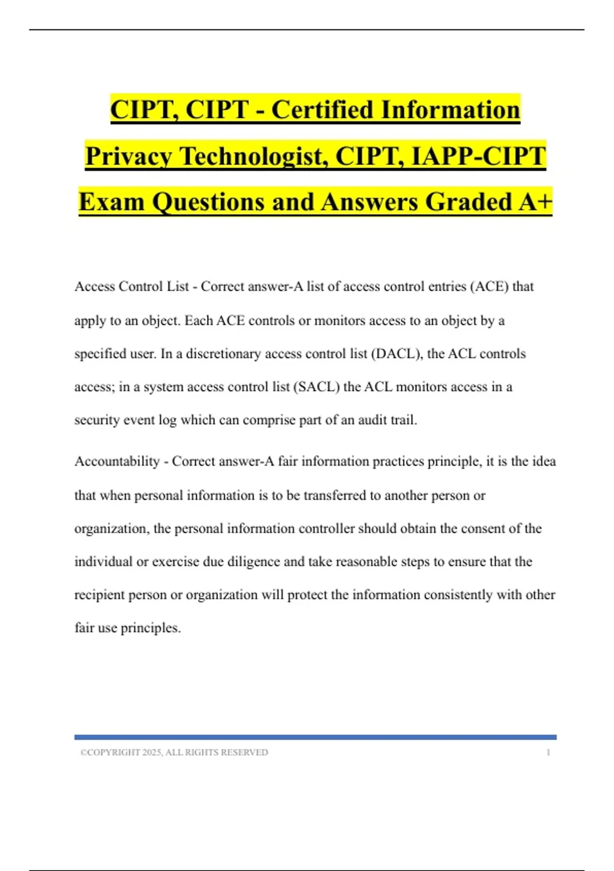 CIPT, CIPT - Certified Information Privacy Technologist, CIPT, IAPP-CIPT Exam Questions and Answers Graded A+