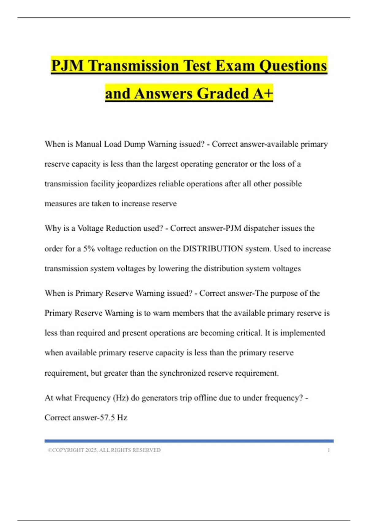 PJM Transmission Test Exam Questions and Answers Graded A+