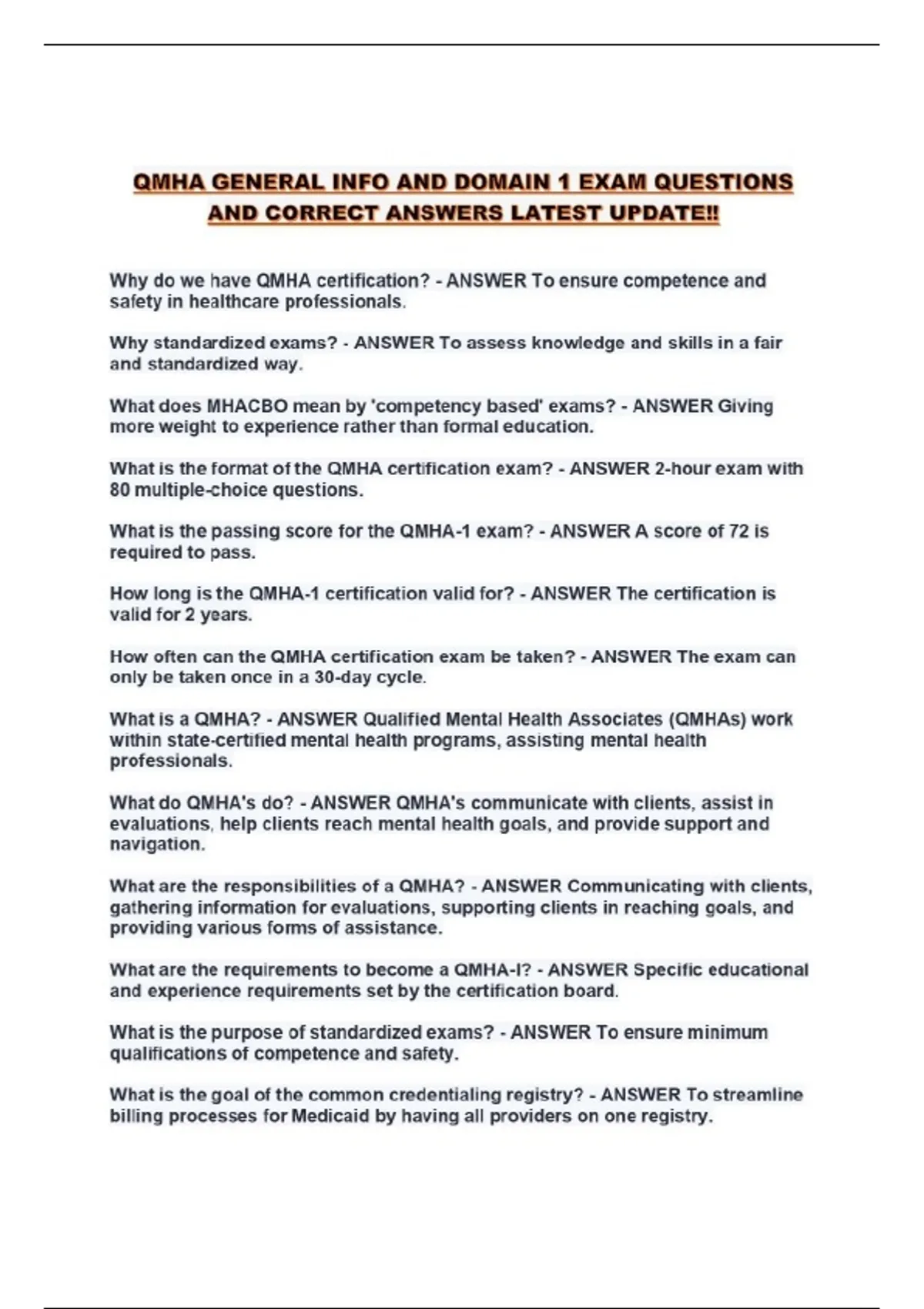 QMHA GENERAL INFO AND DOMAIN 1 EXAM QUESTIONS AND CORRECT ANSWERS LATEST UPDATE!!...