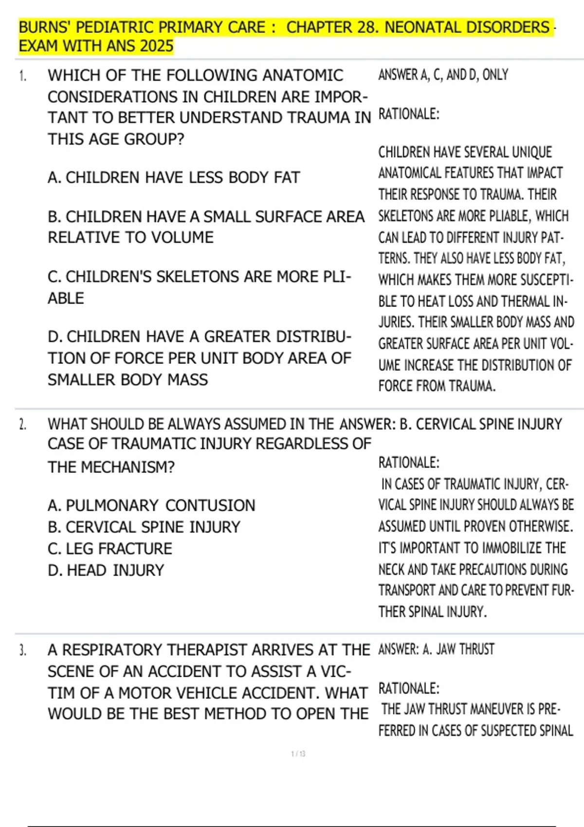 2. WHAT SHOULD BE ALWAYS ASSUMED IN THE ANSWER: B. CERVICAL SPINE INJURY